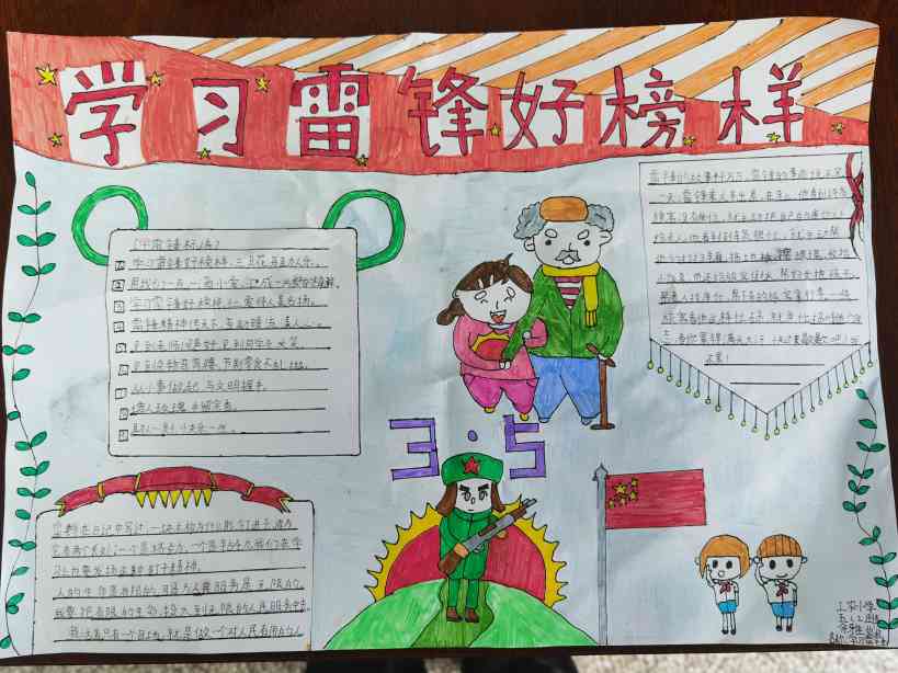 ~ 在学雷锋活动中,各中队涌现出了一大批学习雷锋的积极分子和优秀班干,他们踊跃参与,在制作过程中更深地了解了雷锋,重温雷锋事迹,明确雷锋精神的内涵经过。学校进行认真的汇总和评比,最终评选出优秀作品。