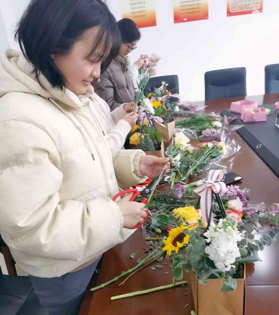 ~ 活动中,学校为女教职工分发了鲜花、蛋糕和零食,并请来插花老师现场指导教学,女教职工积极主动参加到活动中。活动现场,欢声笑语,鲜花朵朵,香气四溢。在这美丽的季节,大家展示了积极向上、美丽健康的精神风貌,收获了健康和快乐的好心情。