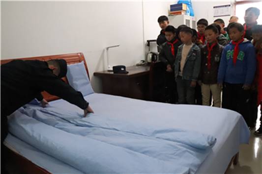 本次活动由定远县三和集镇派出所李鹏所长主持。李所长向参加本次活动的师生介绍了参加活动的各位警官,向参加活动的同学们进行了未成年人思想道德和法制教育知识讲座;缪警官向全体师生讲解和展示了各种防护器具和使用方法;师生们参观了警员们的宿舍并观看了董警官叠“豆腐块”被子的全过程,同学们看着董警官叠被子的过程都情不自禁的发出阵阵的感叹声和热烈的掌声,缪警官又带着同学们参观了派出所日常工作的场所。