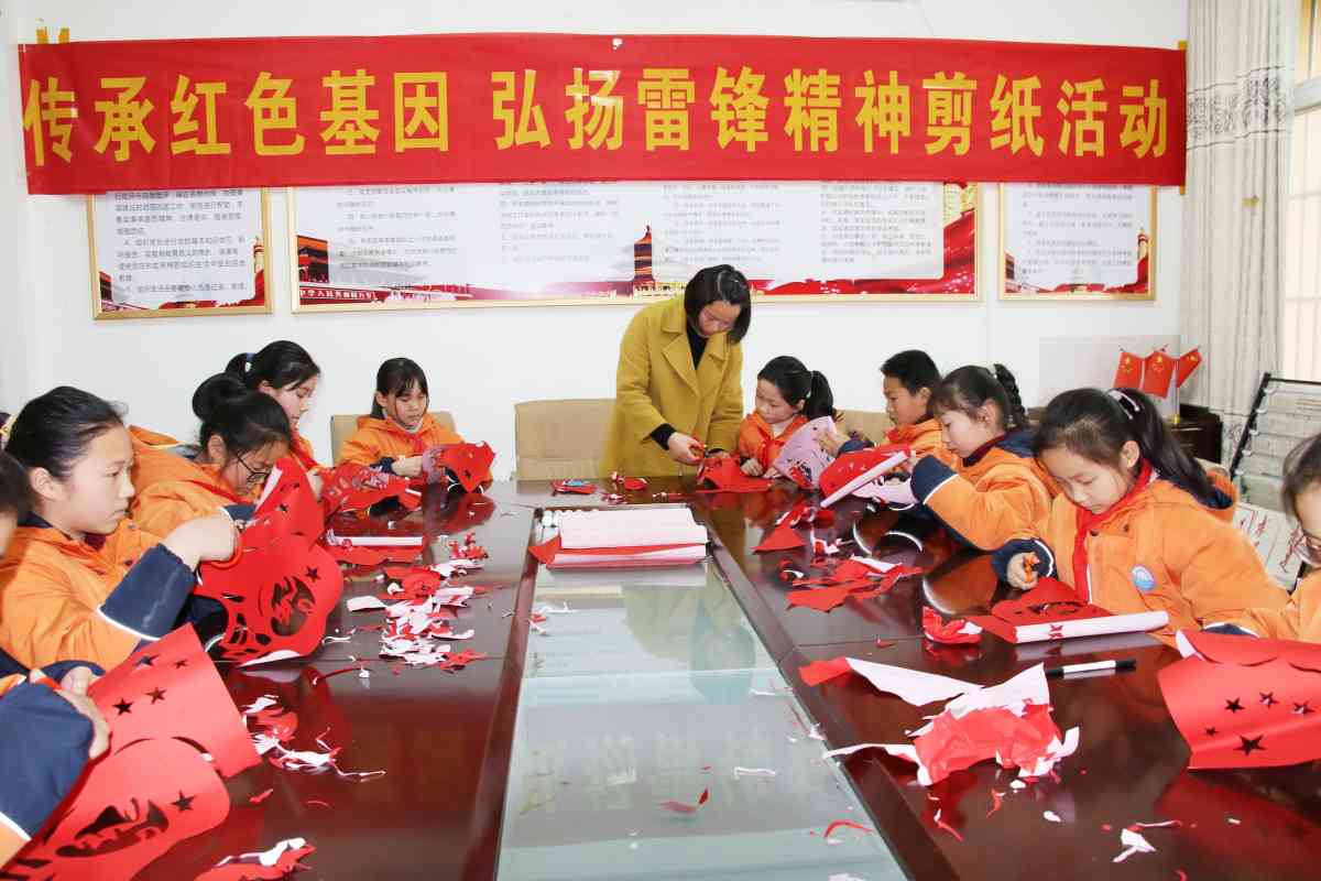 ~ 3月5日,定远县花园湖小学13名剪纸爱好者,在非物质遗产剪纸继承人、定远县花园湖小学美术教师张玲的组织下,开展“传承红色基因 弘扬雷锋精神剪纸活动”。张老师给孩子们讲雷锋故事,教学生剪雷锋形象,用剪纸这一中国传统艺术为载体传承雷锋精神。