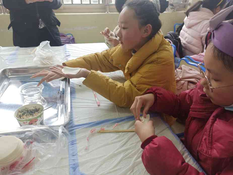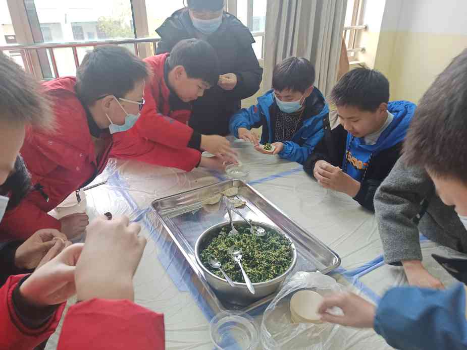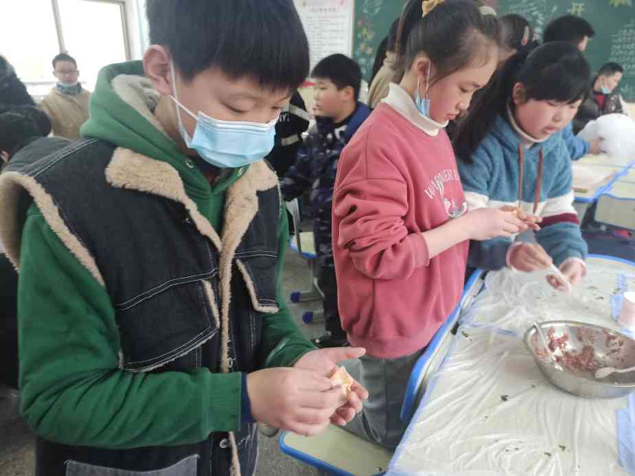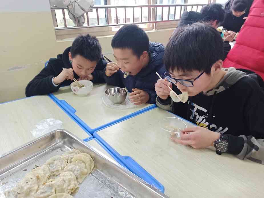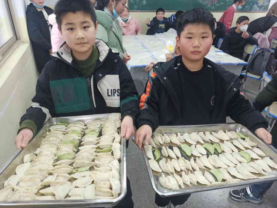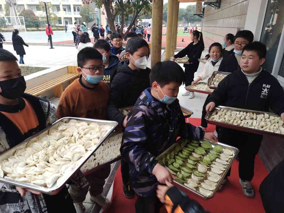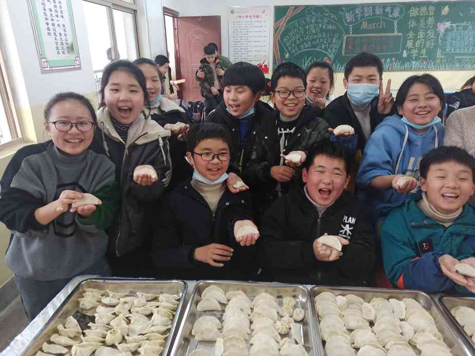 ~ 2021年寒假期间,学校要求毕业班的孩子跟家长学做和春节有关的节日食品,所以在活动中,孩子们动作娴熟,不到一个小时,餐盘里就摆满了或大或小、颜色各异、花样繁多、充满创意的饺子。看着自己包的饺子,学生们的脸上露出了自豪的笑容。