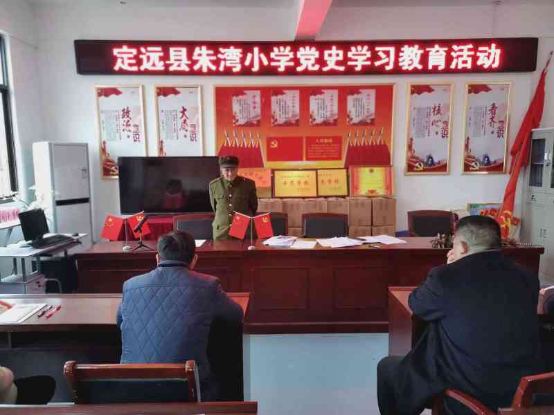 3月19日,定远县朱湾小学党支部在党员活动室开展“党史学习教育”活动,活动由党支部书记黄祎主持,新四军老战士严明友同志及全体党员参加。