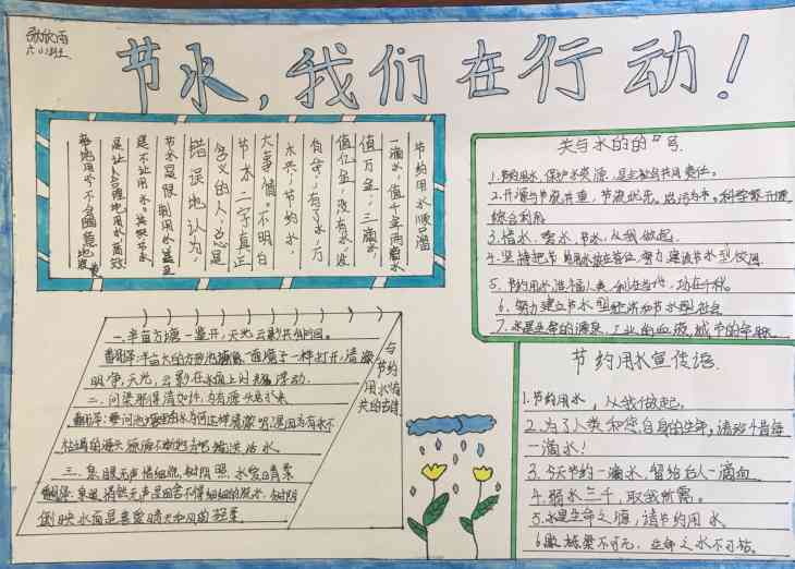 ~ 各小队又以节水为主题制作队报,向师生宣传水利知识、普及节水常识,旨在进一步增强学生的节约用水意识,并通过他们影响家庭、社会,增强全社会的水忧患意识,提高公众参与保护水资源的自觉性,牢记水是生命之源,要珍惜身边的每一滴水,争做节水的小标兵。