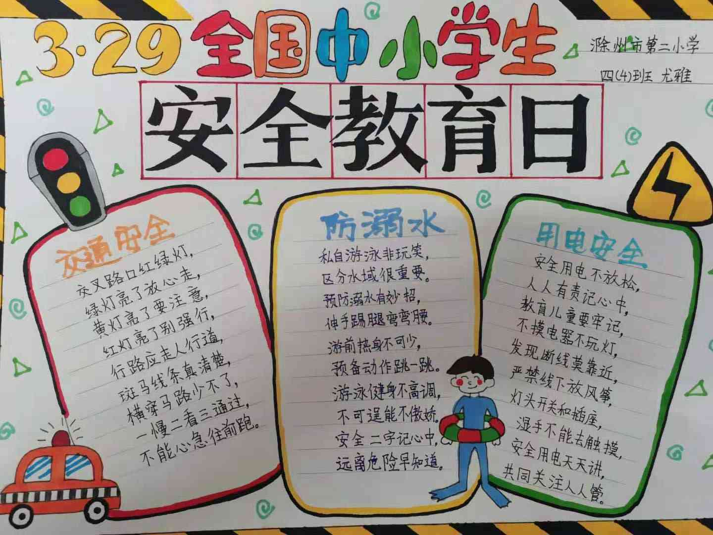 ~ 各班级报送优秀手抄报绘画70余幅,经过评审组精心评选,40余名优秀作品脱颖而出,分别荣获一等奖、二等奖、三等奖。通过本次活动调动了学生的积极性,能够从各方面正确认识到安全的重要性。(黄德元 吕祥根)