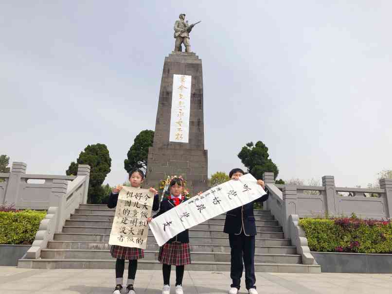 ~ 纪念碑前,《少年博览》红领巾小记者代表陶思源、潘子墨和鼓号队指挥张梓琳进行了诗朗诵《那一抹闪闪的秋色》——致敬革命烈士秋瑾,“从此,历史长空有了那一抹闪闪的、耀眼的秋色,永不老去……”队员们在认真的接受这场触及灵魂的精神洗礼,引导队员永远铭记革命先辈的牺牲与奉献。小军属刘晓雅和李梓妍展示了2020年度滁州市“新时代最美军娃”六3中队周奥的书法作品,号召广大队员永远听党话跟党走。