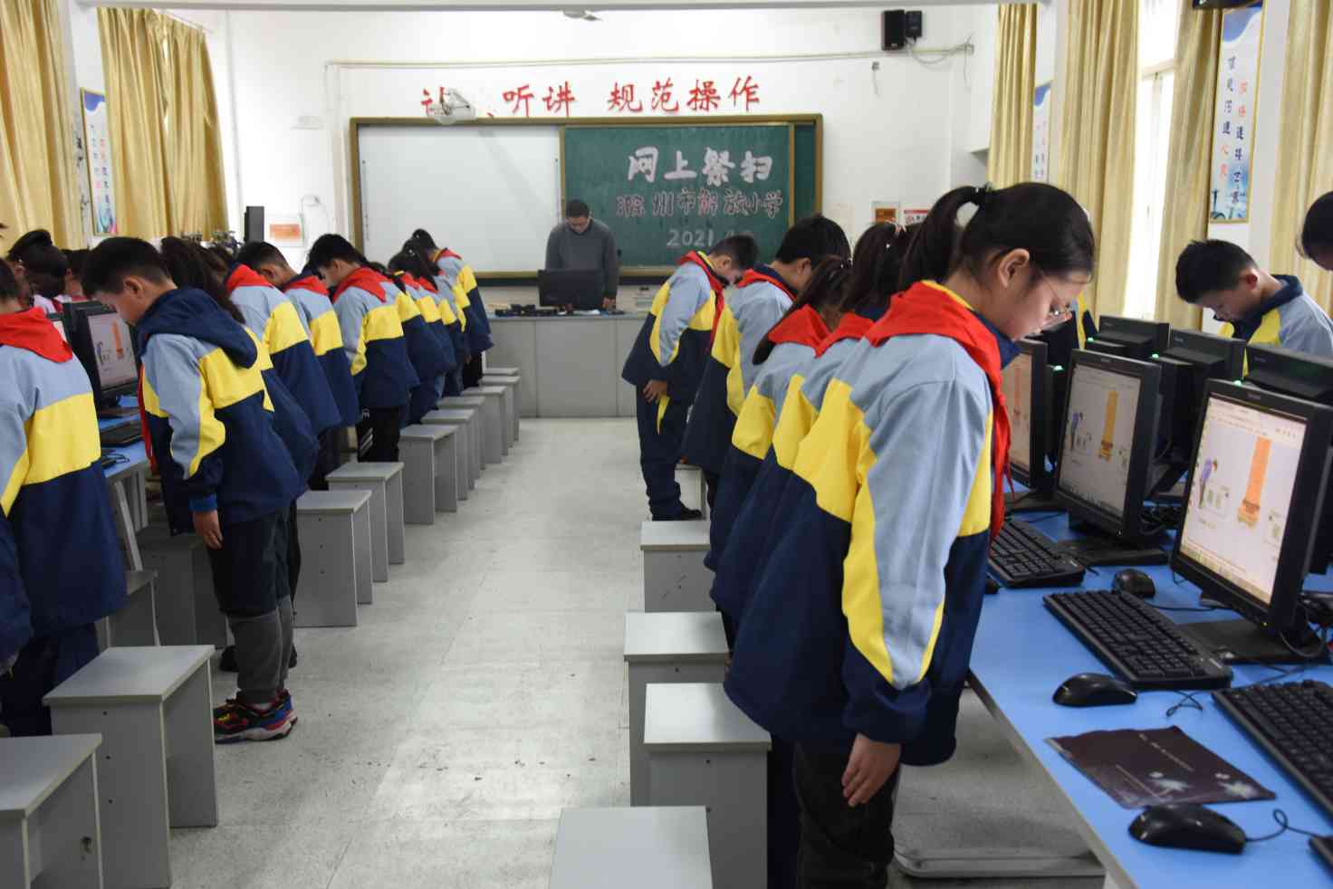 ~ 队员们在计算机王老师的指导下登陆滁州文明网“我们的节日 清明”专题,向革命烈士鞠躬、献花并签名寄语,以此缅怀烈士的丰功伟绩,追忆烈士之德。