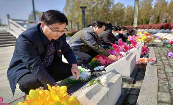在革命烈士墓地,全体党员认真擦拭墓碑并向革命烈士三鞠躬。