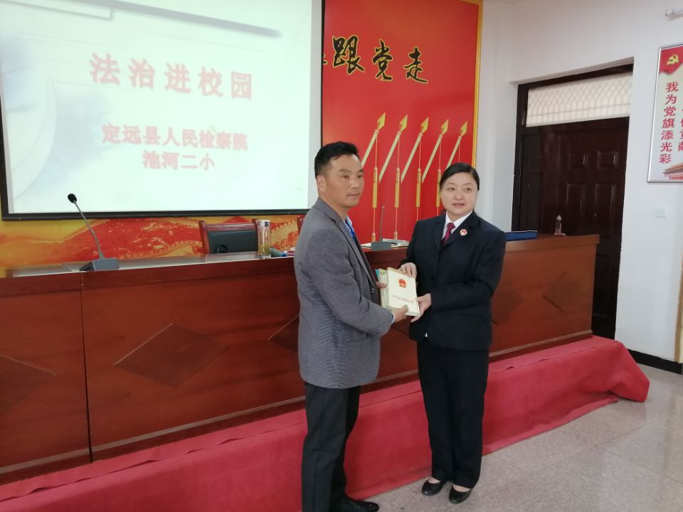~ 讲座结束后,定远县人民检察院还向池河二小捐赠了《民法典》图书,校支部书记张道胜代表学校接受了捐赠。(供稿:李章国 审核:张道胜)