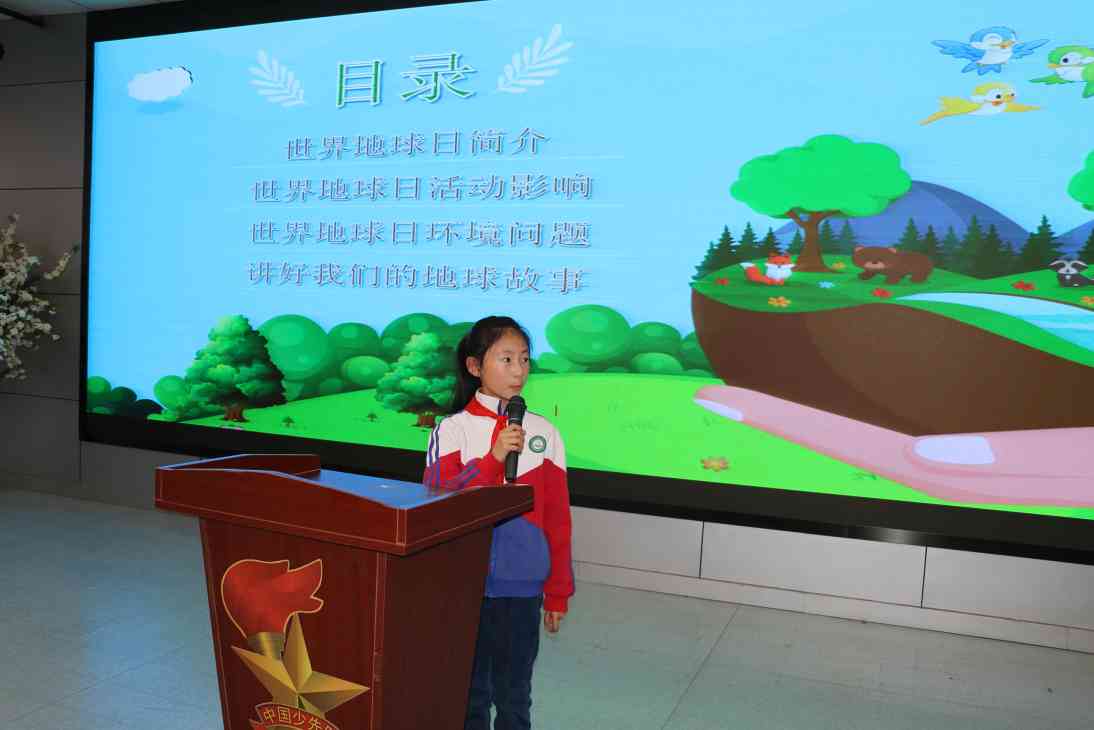 ~ 四(5)班的少先队员代表在学校学术报告厅以“从身边做起,保护地球”为主题向大家介绍了世界地球日的来历以及威胁人类的十大环境问题,如何讲好我们的地球故事等,引导孩子们分析身边常见的破坏环境的行为,教育孩子们从身边点滴小事做起,保护地球母亲。抑扬顿挫、深沉坚定的语调彰显了孩子们对伤害地球母亲行为的憎恶和保护地球母亲的决心;表达了少年儿童对山清水秀、鸟语花香的美好生活的向往和追求。