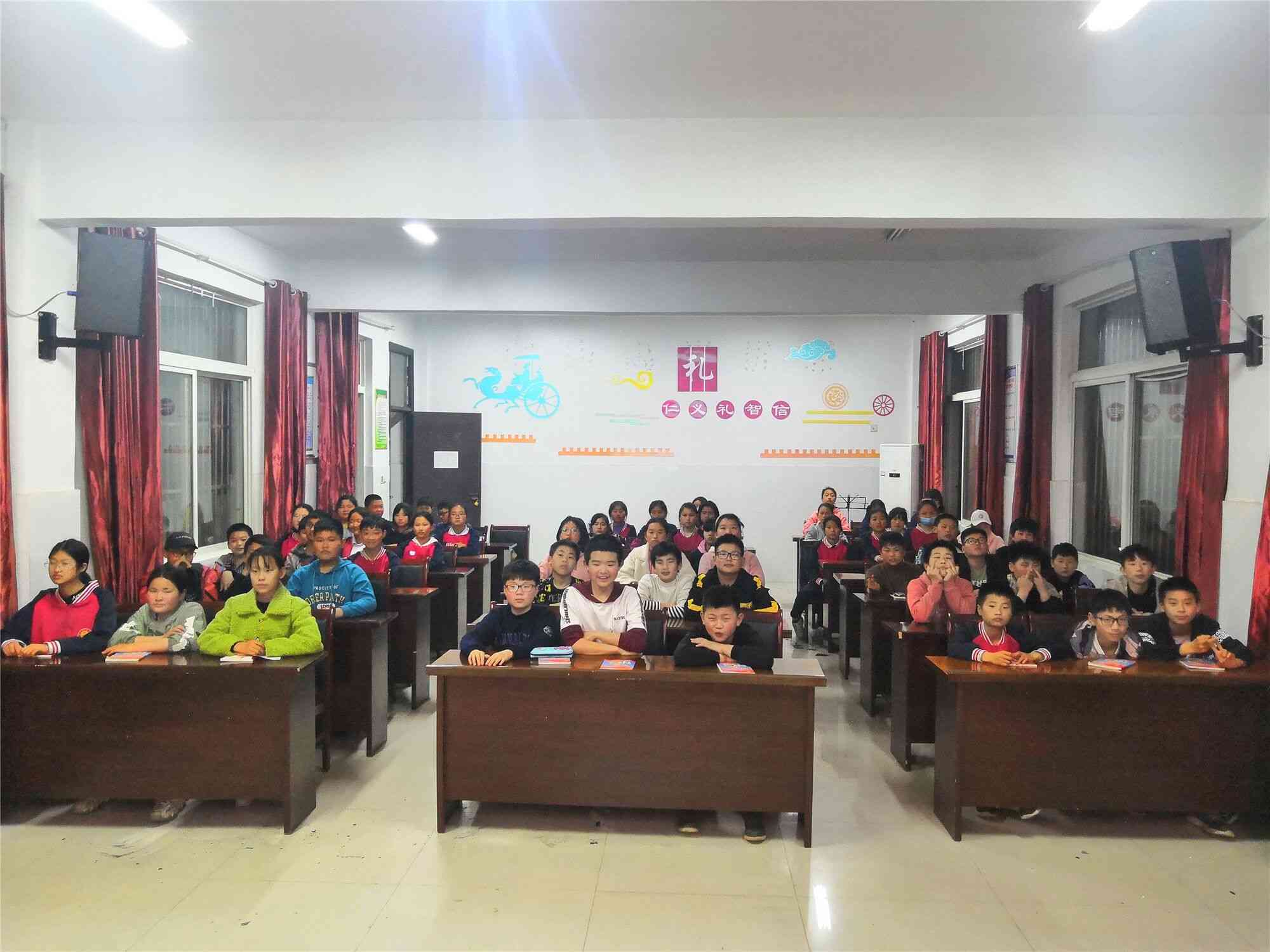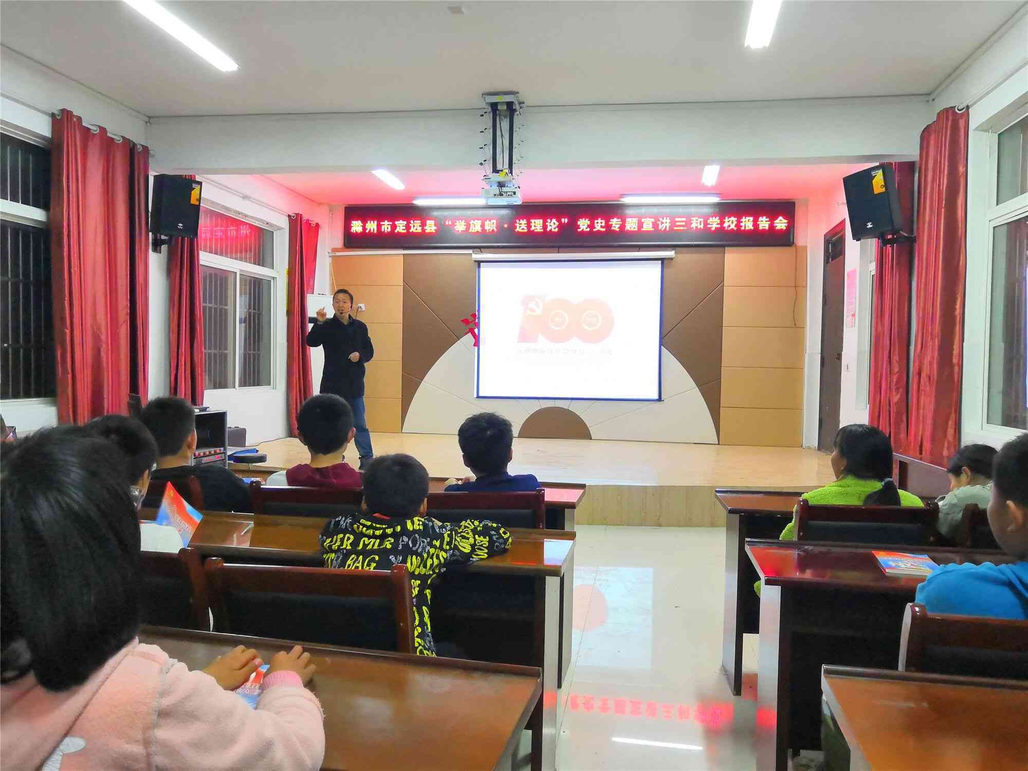 4月27日晚,定远县三和学校少年宫道德讲堂座无虚席,同学们正在聆听党史教育,该校“举旗帜•送理论”党史专题宣讲报告会正式拉开序幕。根据校党支部安排,当晚的报告会由思政课老师盛少堂主讲,分九年级和六年级两场进行。