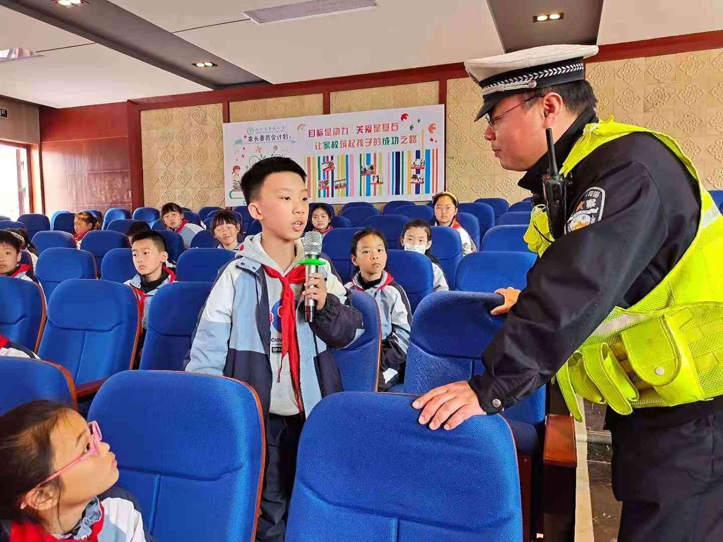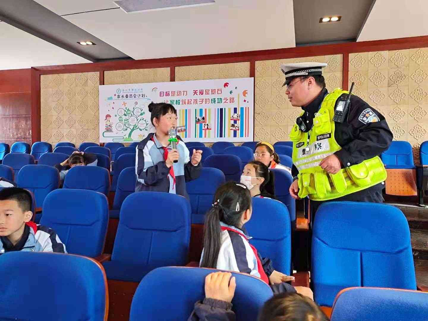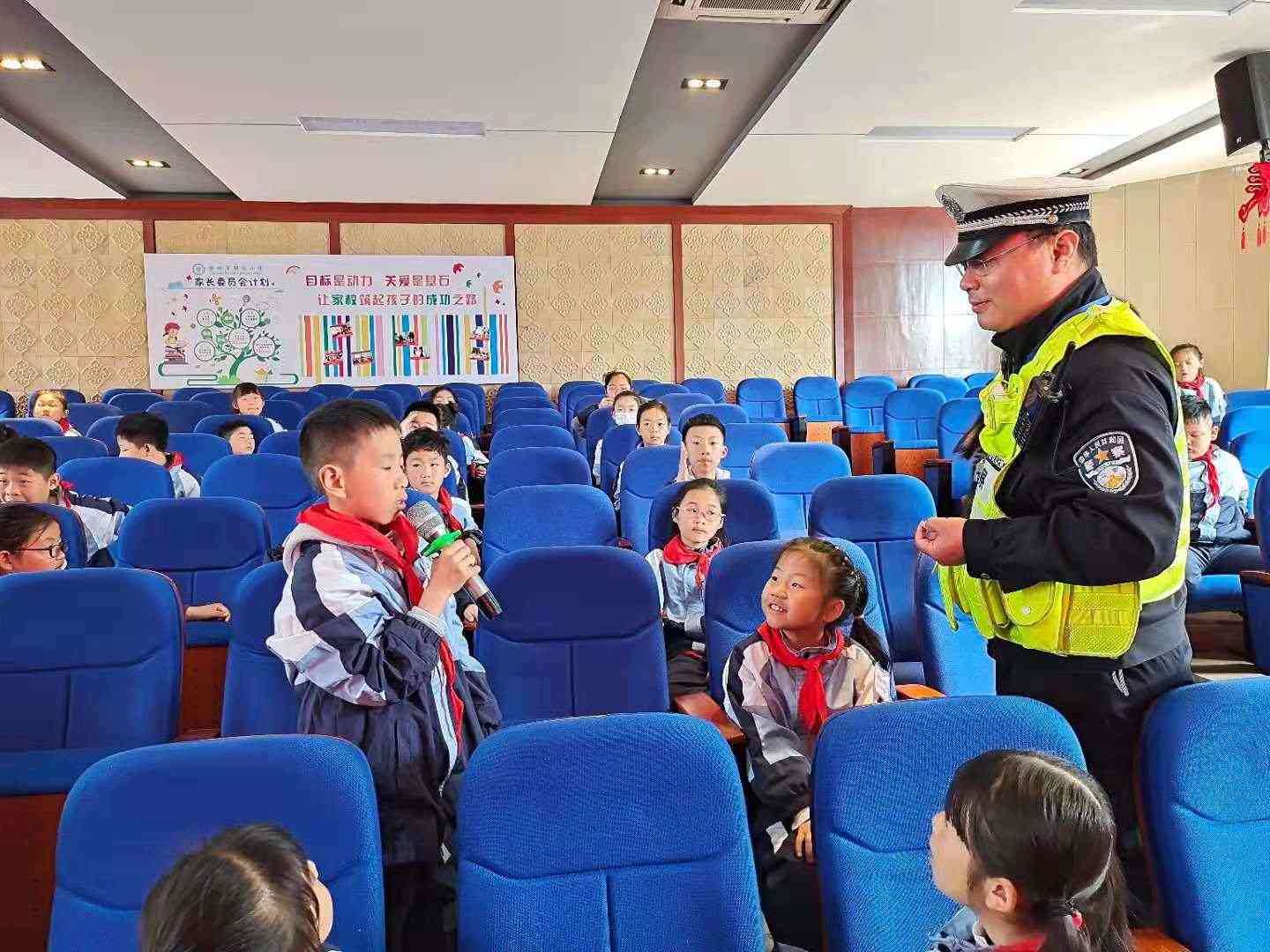 ~ 胡警官指导队员们练习交通指挥手势,队员们认真地做着,并反复练习着。胡警官和队员们进行交通安全相关知识的互动问答,队员们大胆提问,积极讲述自己经历过、看过、听过的交通安全有关的故事,胡警官耐心地为大家一一解答。
