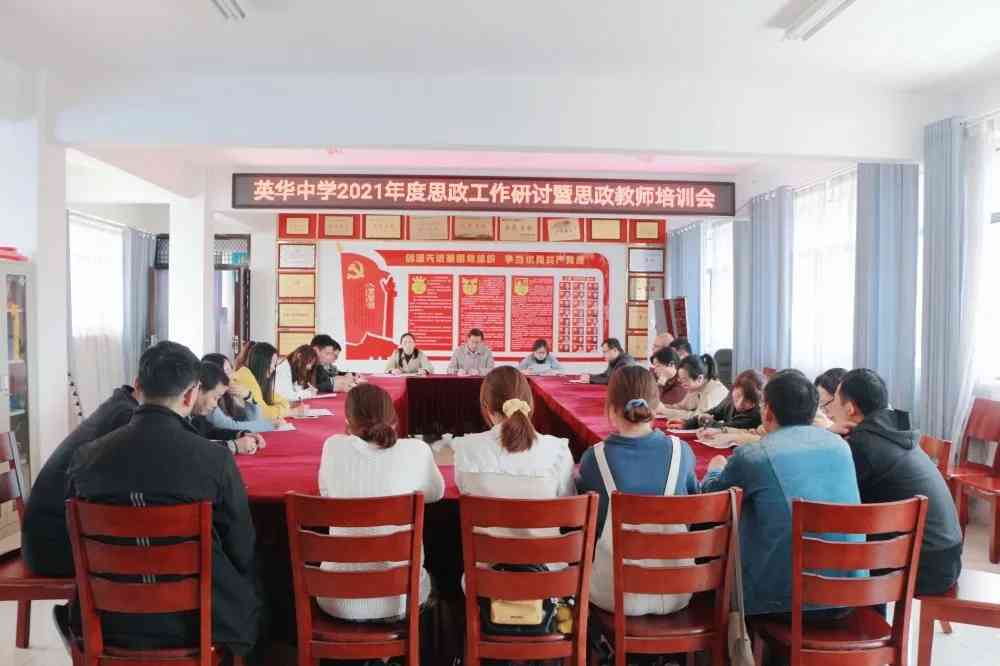 ~ 4月28日上午,定远英华中学在二楼行政会议室召开2021年度思政工作研讨暨思政教师培训会。校党支部书记张雪丽主持培训会并就学校切实做好思政课工作,进一步加强未成年思想道德建设工作提出严格要求。两学部分管副校长、教务处主任及全校思政教师参加了会议。