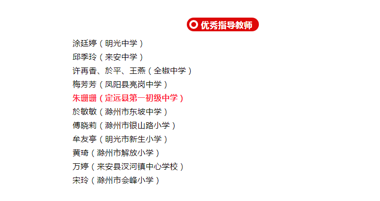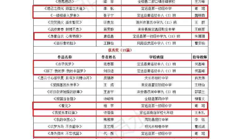 ~ 5月8日,中共滁州市委宣传部、滁州市委教育体育工作委员会主办的以“爱国心·报国情·强国志”为主题,开展面向全市青少年的征文活动获奖名单公布。定远县第一初中多名同学在活动中获奖。