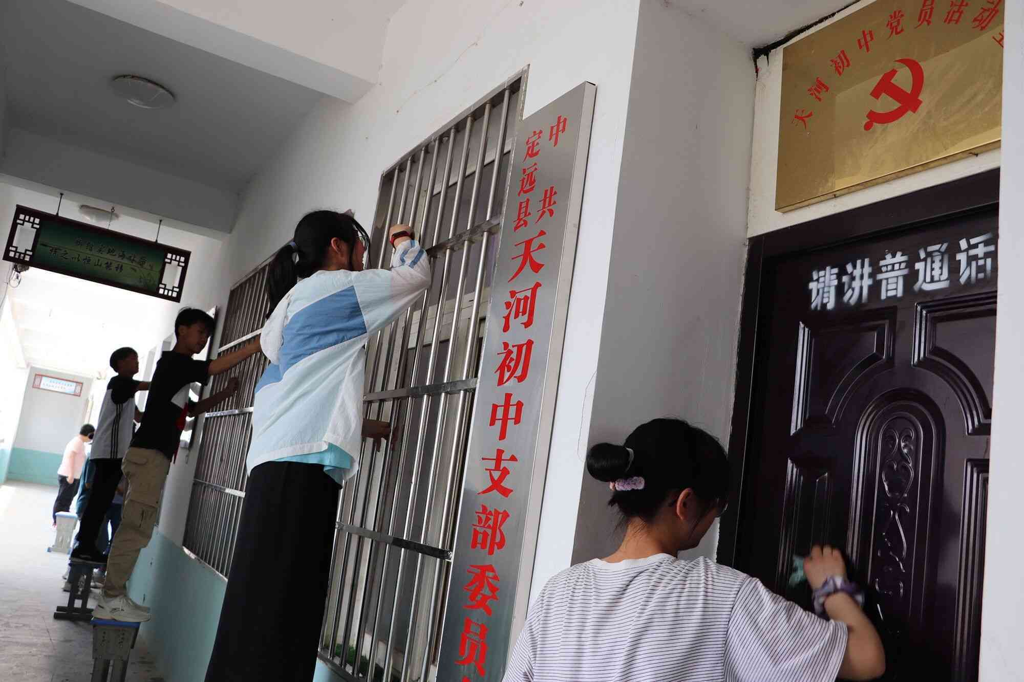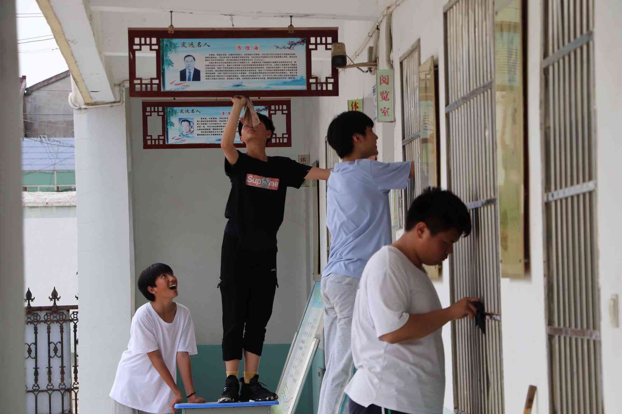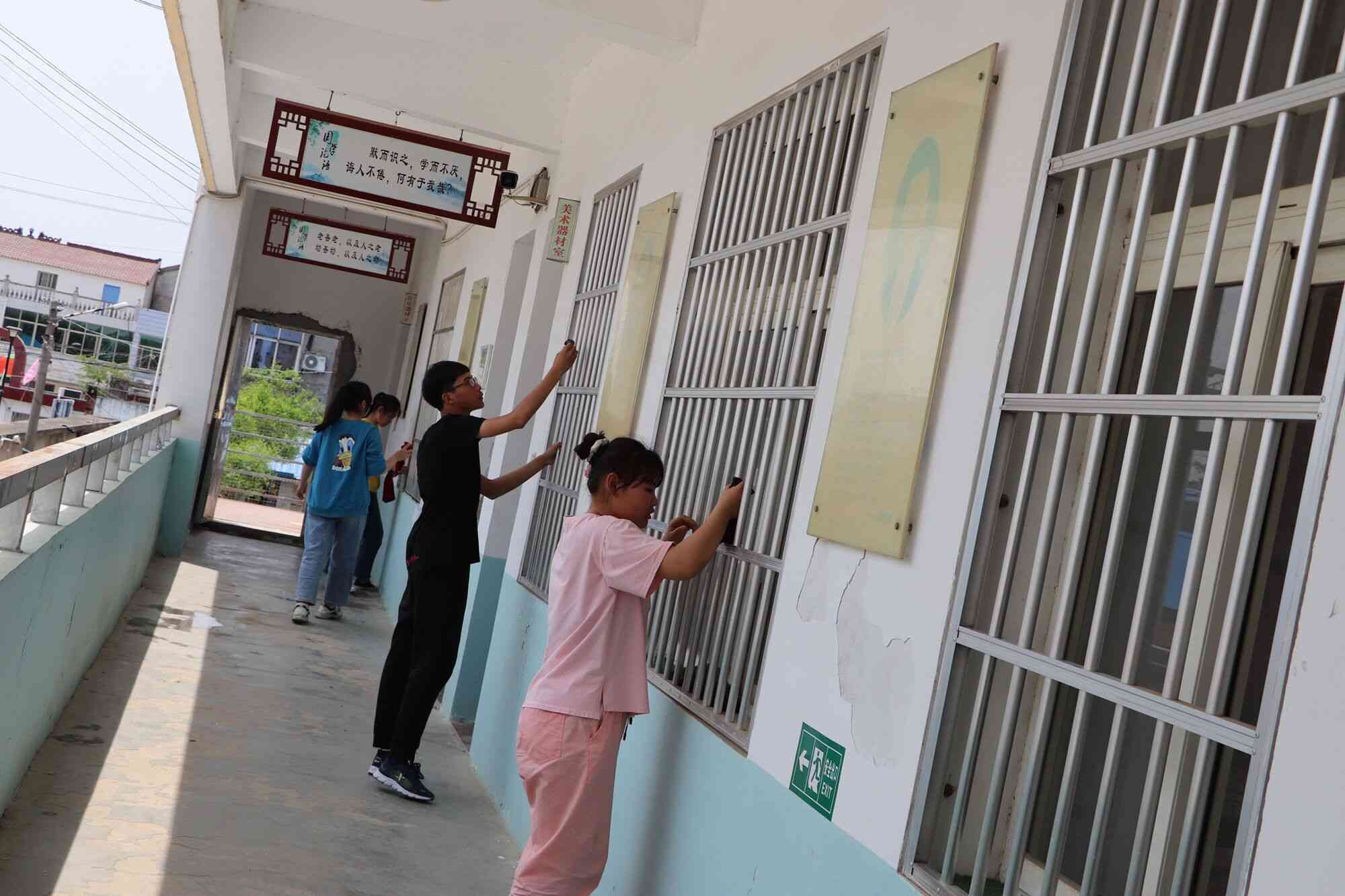 烈日里,总务处联合各班主任带领全体同学对教学楼楼梯、门窗、地面、天花板及卫生死角进行了卫生彻底打扫。