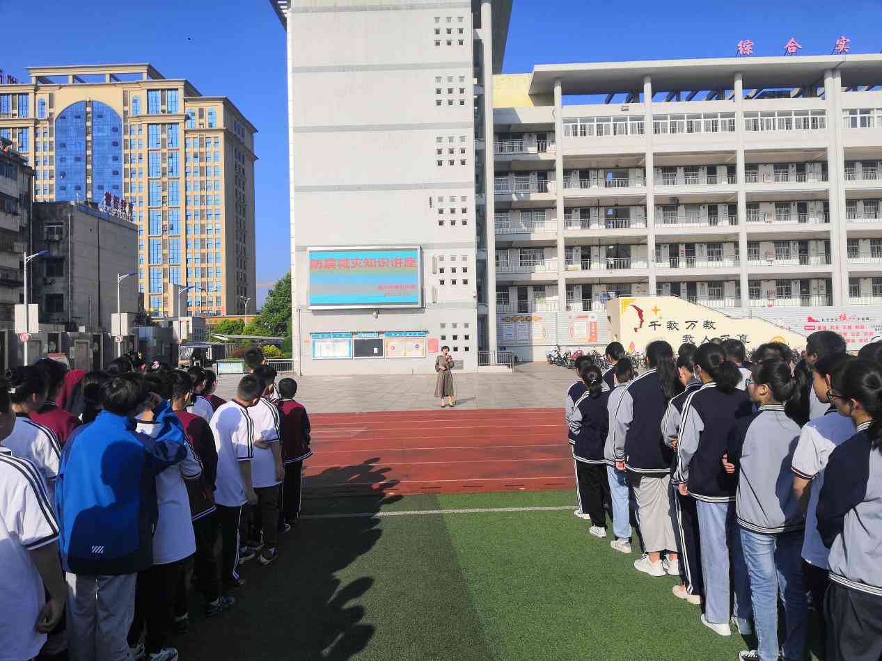 ~ 活动中,八(2)班围绕“科学减灾,依法应对”这一主题,详细说明了地震的危害性以及应对措施,并告诉同学们不仅自身要懂得如何避险,还要将自己学会的防震知识传授给家人,让家人也学会当地震来临时如何自救。