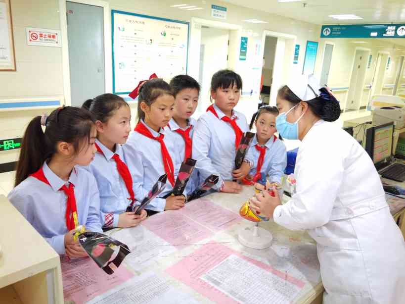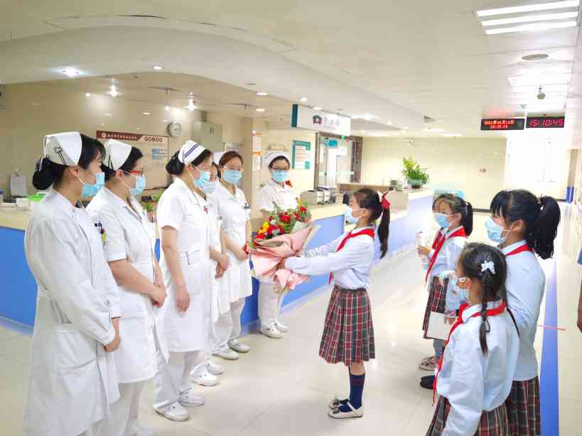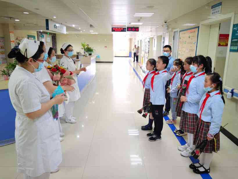 ~ 三八中队的门瑞婕同学先向中西医住院部9楼心血管一科的张继秀护士长送上了鲜花,接着护士们给孩子回赠了鲜花,并鼓励孩子们要好好学习。其他几名同学都送上了自己亲自做的手抄报,三八中队的张弦同学和孙晨同学为护士献上了诗朗诵《最可爱的人》。心血管一科的张继秀护士长和谈帅护士为孩子们上了一节简短的心脏科普知识和急救的方法,孩子们纷纷感到获益良多。回来之后接着,在班级开展了弘扬南丁格尔精神 彰显当代护士风采的主题队会,孩子们纷纷感受到收获颇丰。