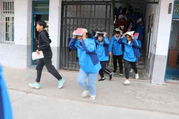 随着一声急促的地震警报声响起,师生迅速采取防震应急避险行动,学生双手抱头或用书顶在头上快速隐蔽到书桌下方。警报声解除后,学生在班主任和任课教师的指挥下有序从教室撤离到指定的安全位置。