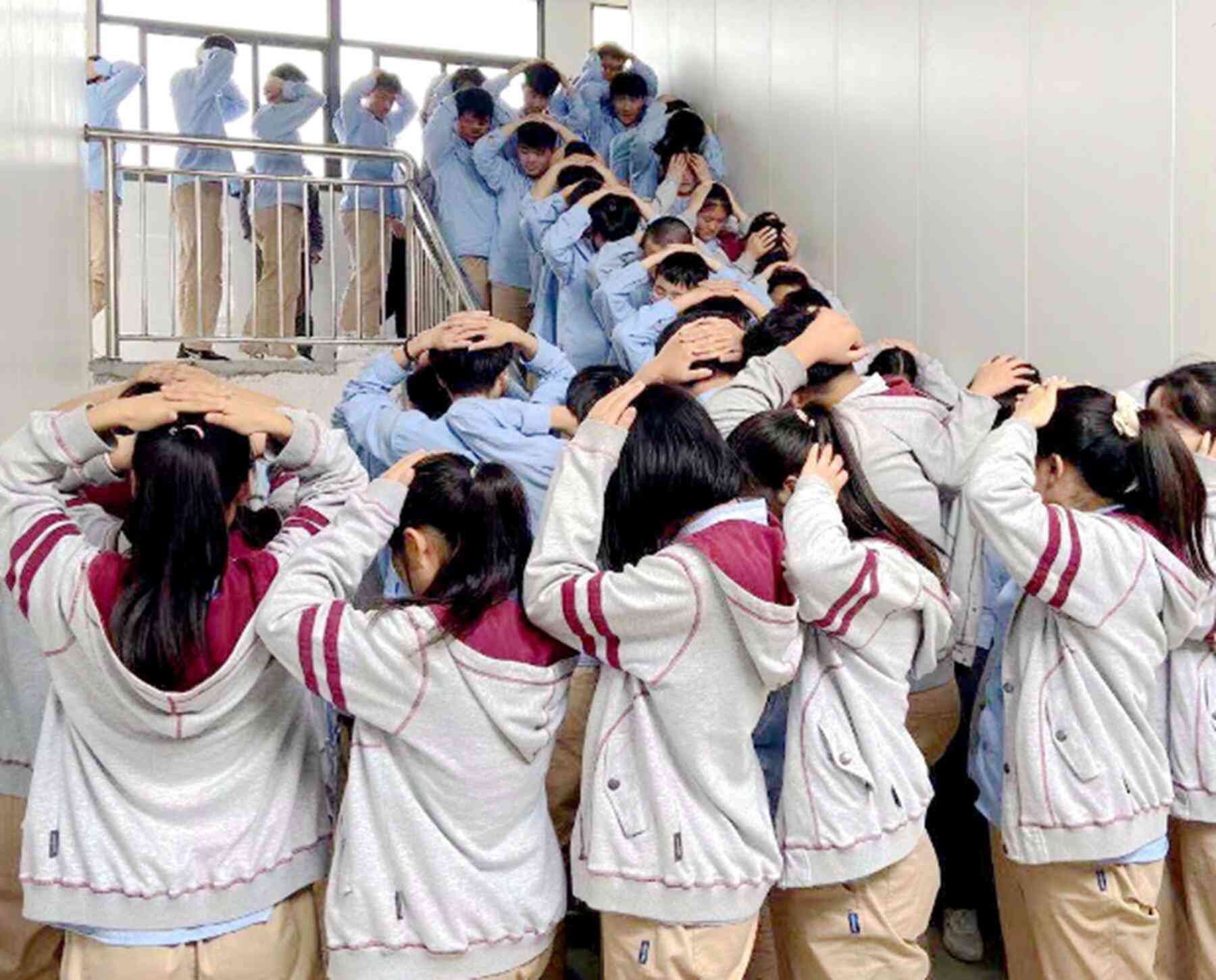 ~ 上午9点20,急促刺耳的警报声突然响起,打断了原本沉浸在课堂里的孩子们,正在上课的老师们迅速组织学生们采取自救措施,他们有的用胳膊护住头部,有的钻到桌子下,有的蹲在墙角边。在各班级老师的迅速组织下,同学们有序地按照规定逃生路线向外撤离疏散,并在指定的安全区域集合。