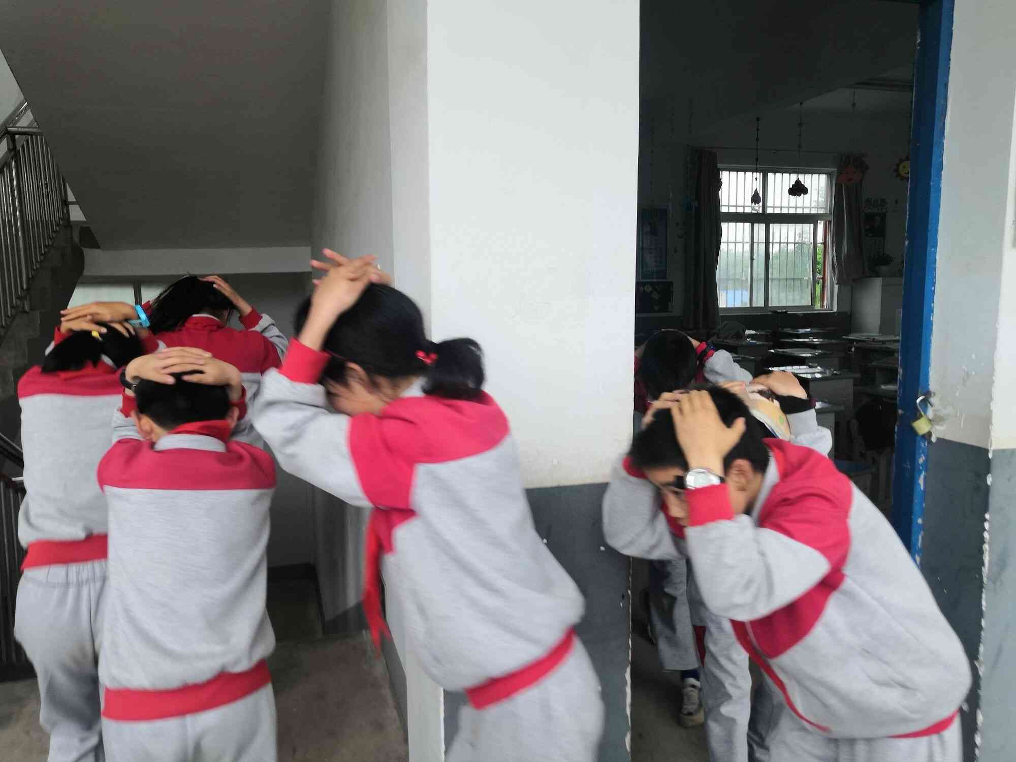 随着一阵急促的地震报警声响起,所有学生迅速抱头、蜷曲身体,降低身体重心,躲在各自的课桌下,尽可能用双手保护头部。随后学生在老师指挥下,双手护头,迅速、有序地从教室向操场空旷撤退。全校师生在1分钟内按预定路线迅速撤离指定地点。全程做到了快、静、齐,整个演练过程师生互助有序、配合默契、学生动作敏捷、规范,没有推拉、冲撞、拥挤现象发生。