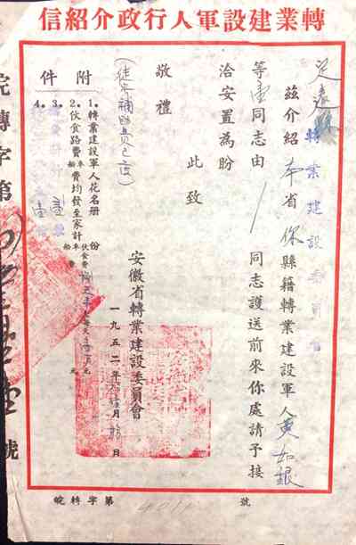 这次与日寇作战,父亲左手拇指中弹负伤失去一骨节,食指第二节骨折,愈合后功能受限,评定为三等甲级伤残。父亲1948年7月归队,随后编入第三野战军第九兵团,参加了解放战争,并于1950年10月至1952年11月,参加了抗美援朝。父亲抗美援朝所在部队是第三野战军九兵团后勤二分部独立营。父亲常说:“战场上刀枪无眼,我脑海里只有一不怕苦,二不怕死的念想,奋勇向前!”