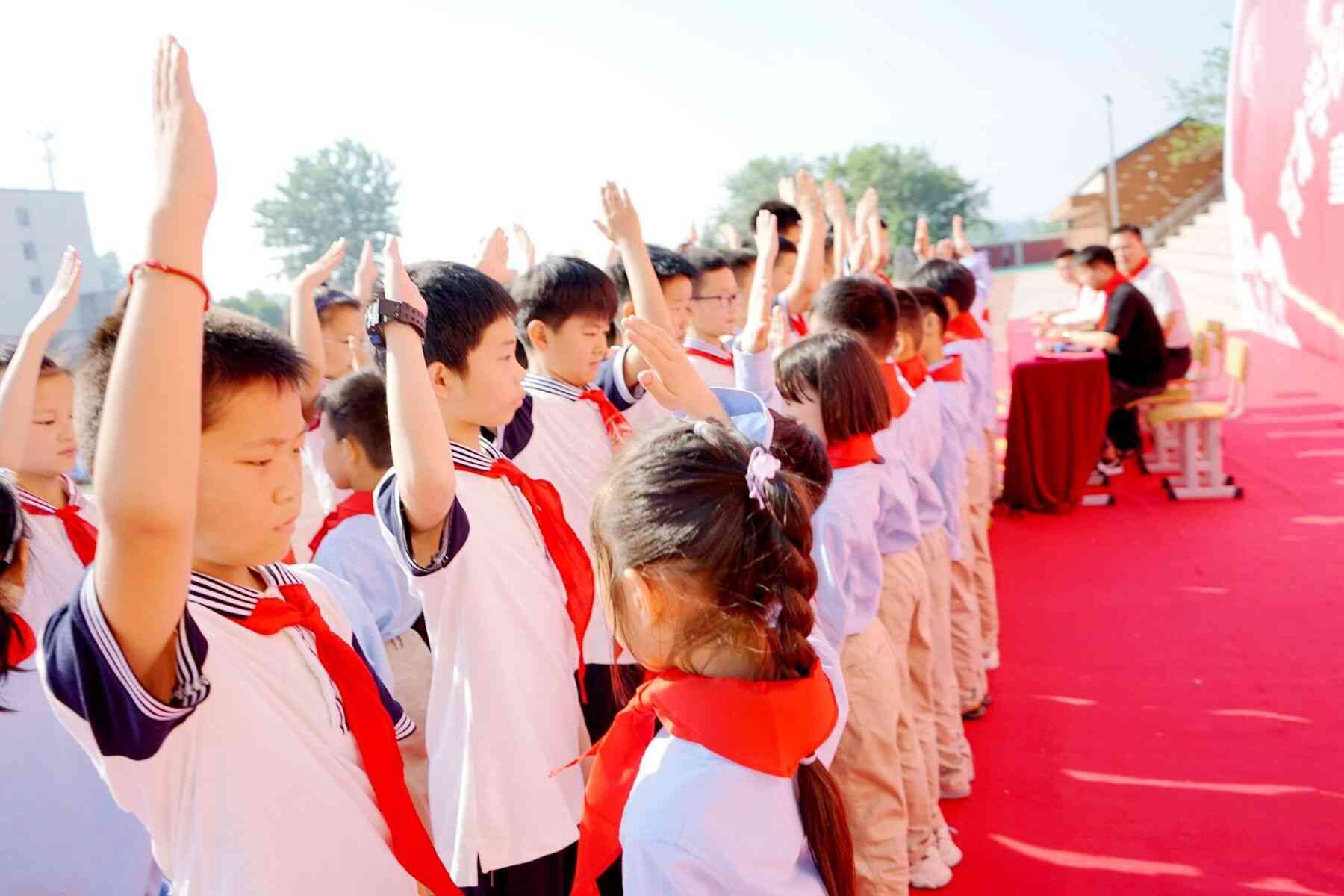 ~ 5月30日,定远县育才学校举行“童心向党 传承红色基因”六一儿童节文艺汇演暨少先队员新队员入队仪式,同学们通过丰富多彩的文艺汇演,庆祝自己的节日并向中国共产党成立100周年献礼。伴随着庄严的出旗曲,大队旗手手执少先队队旗,在护旗手的护航下,迈着坚定的步伐走向仪式现场。在铿锵有力的《中国少年先锋队队歌》后,六年级的老队员们为一年级新队员戴上了鲜艳的红领巾并互敬队礼。在队旗的见证下,新队员迈开了人生成长的重要一步。伴随着嘹亮的呼号声和庄严的退旗曲,育才学校少先队新队员入队仪式圆满结束。