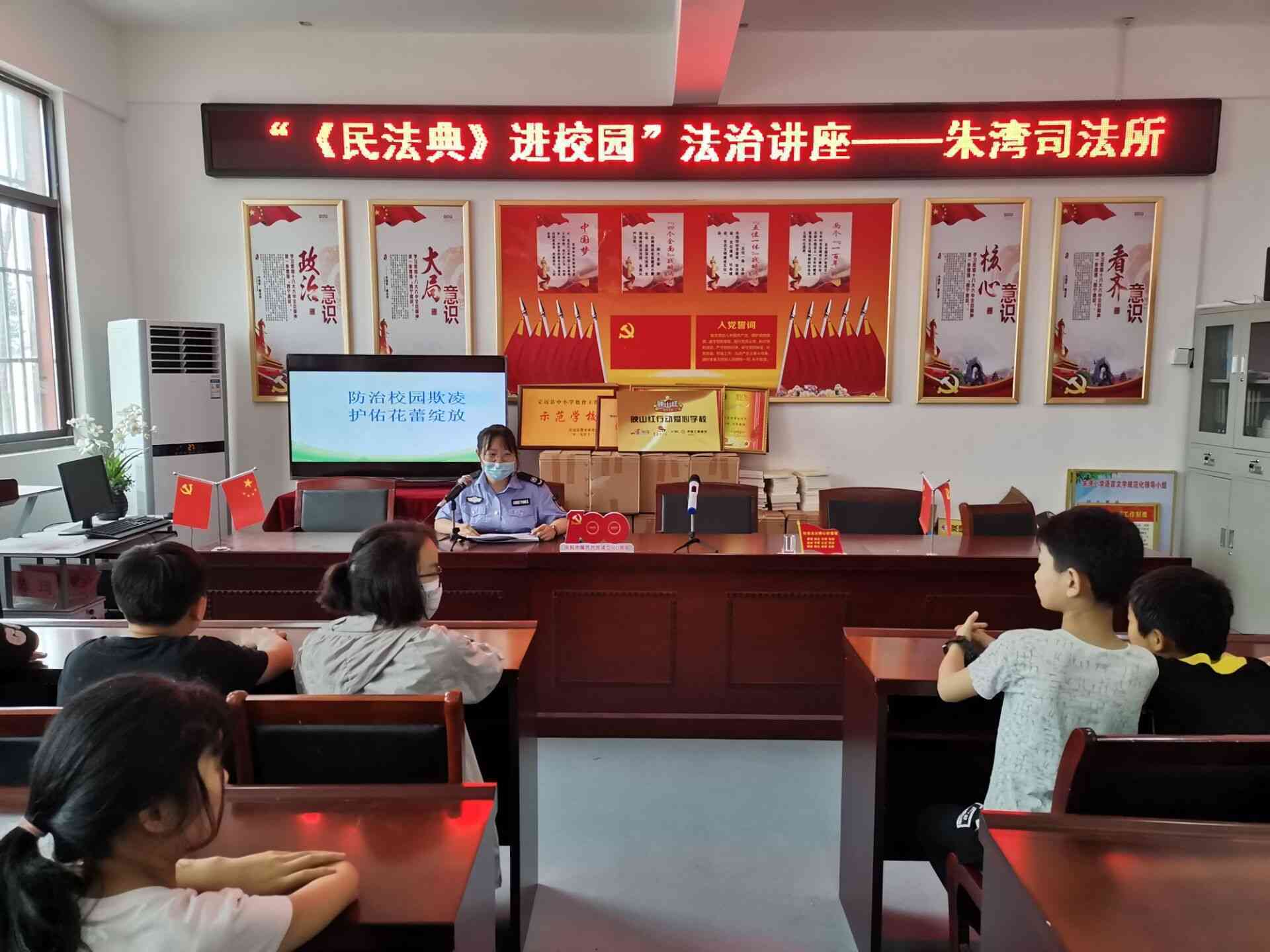 6月10日上午,定远县朱湾镇人民政府、派出所、司法所一行多人至朱湾小学开展法治讲座活动。