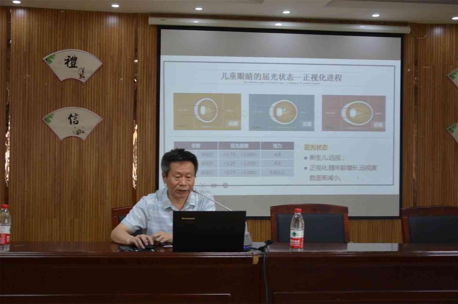 活动中,滁州市综合防控儿童青少年近视专家胡运东教授给老师们带来了《保护视力,远离近视》的主题宣讲。他从眼睛对身体的重要性、视觉发育成熟过程入手,介绍了近视的病因、分类、矫正方式,重点讲述了户外活动、用眼习惯与用眼环境、饮食与睡眠对于儿童青少年近视防控的重要意义,告诫孩子们时刻牢记“一增一减”、“一尺一拳一寸”的用眼习惯,从而拥有一双看得美丽、看得持久、看得舒服、看得清楚的好眼睛。专家用深入浅出,通俗易懂的语言对在场的老师进行了知识普及和方法指导。