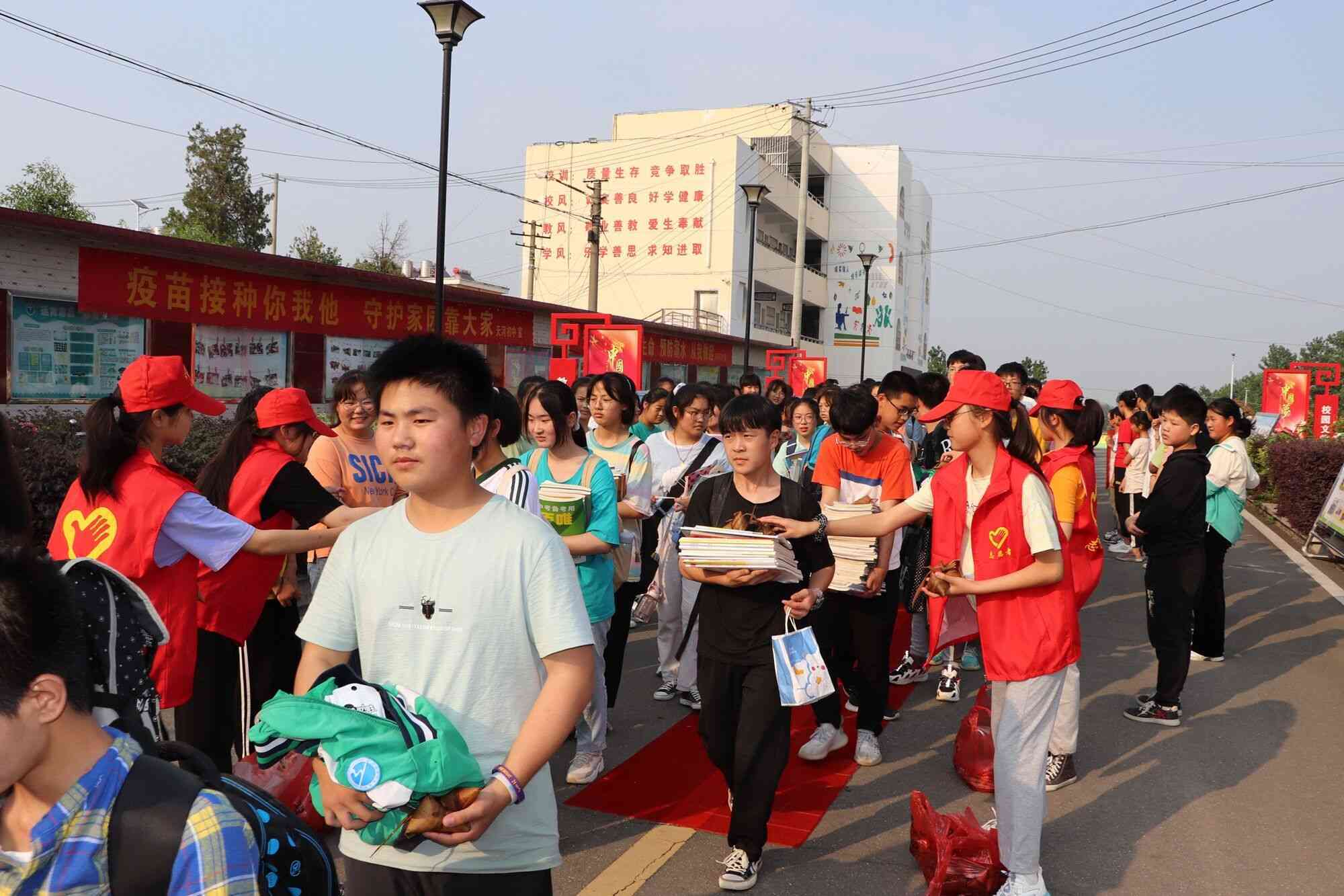 6月11日下午,定远县天河初中的校园主干道两边,七、八年级同学分列道路两侧,用掌声欢送天河初中2021届近百名毕业生。学校领导、毕业班主任、老师和同学们一起为毕业学子们举行欢送仪式。志愿者们为每名毕业生分发粽子两个,祝福同学们中考高“粽”。