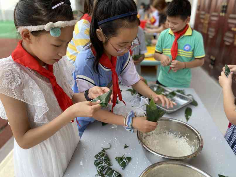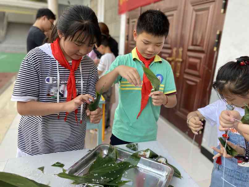 ~ 活动分为四个环节:第一环节:少先队员给留守儿童佩戴香包;第二环节:学生根据分组向家长老师学习包粽子,折叶、盛料、压实、裹叶、扎绳;第三环节:小记者进行采访和缝制香包;第四环节:师生家长合影留念。