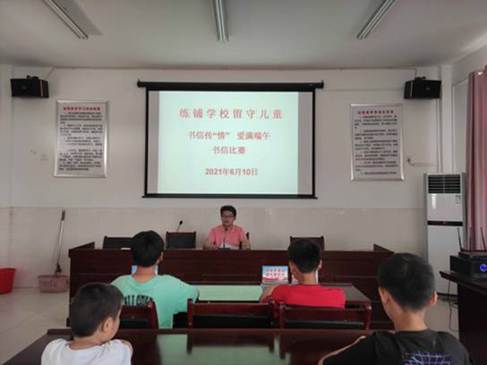 ~ 为了引导留守儿童抒发内心的真情实感,加深留守儿童与父母亲之间的理解和沟通,激发感恩之心,在亲身实践中既感受书信文化的魅力,又感受父母与子女的亲情,推动留守儿童关爱行动的深入开展。6月10日至24日练铺学校开展了以“书信传情爱满端午”为主题书信比赛活动。6月24日颁奖仪式在综合楼三楼大会议室举行。
