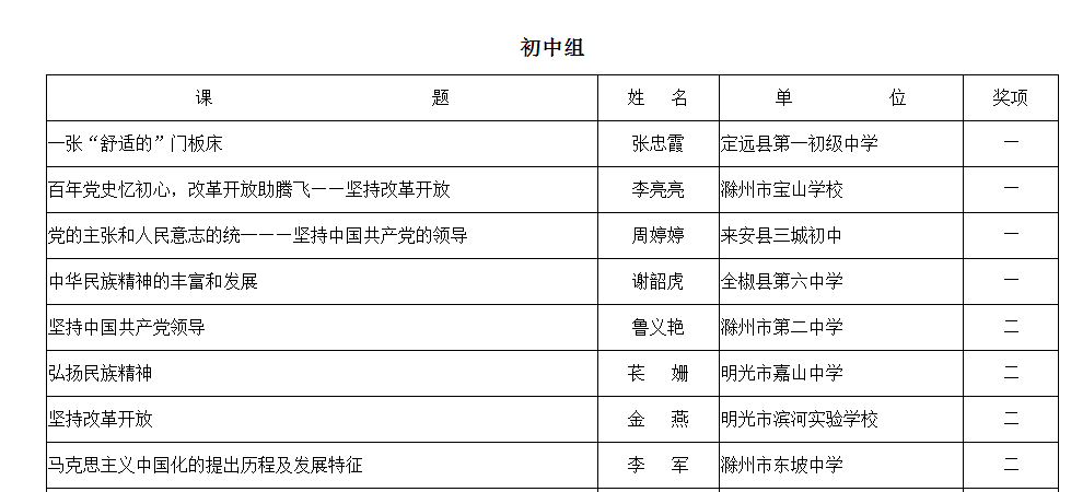 ~ 8月11日,滁州市2021年中小学“思政课教师讲党史”微视频大赛评选结果揭晓,定远县第一初中党支部张忠霞同志报送的微视频《一张“舒适的”门板床》荣获初中组一等奖(一等奖中排名第一)。
