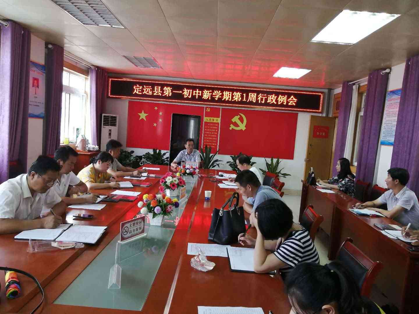 8月25日,定远县朱湾小学在会议室召开了新学期开学准备工作会议。会议由党支部书记、校长杨明主持,该校全体行政人员参会。