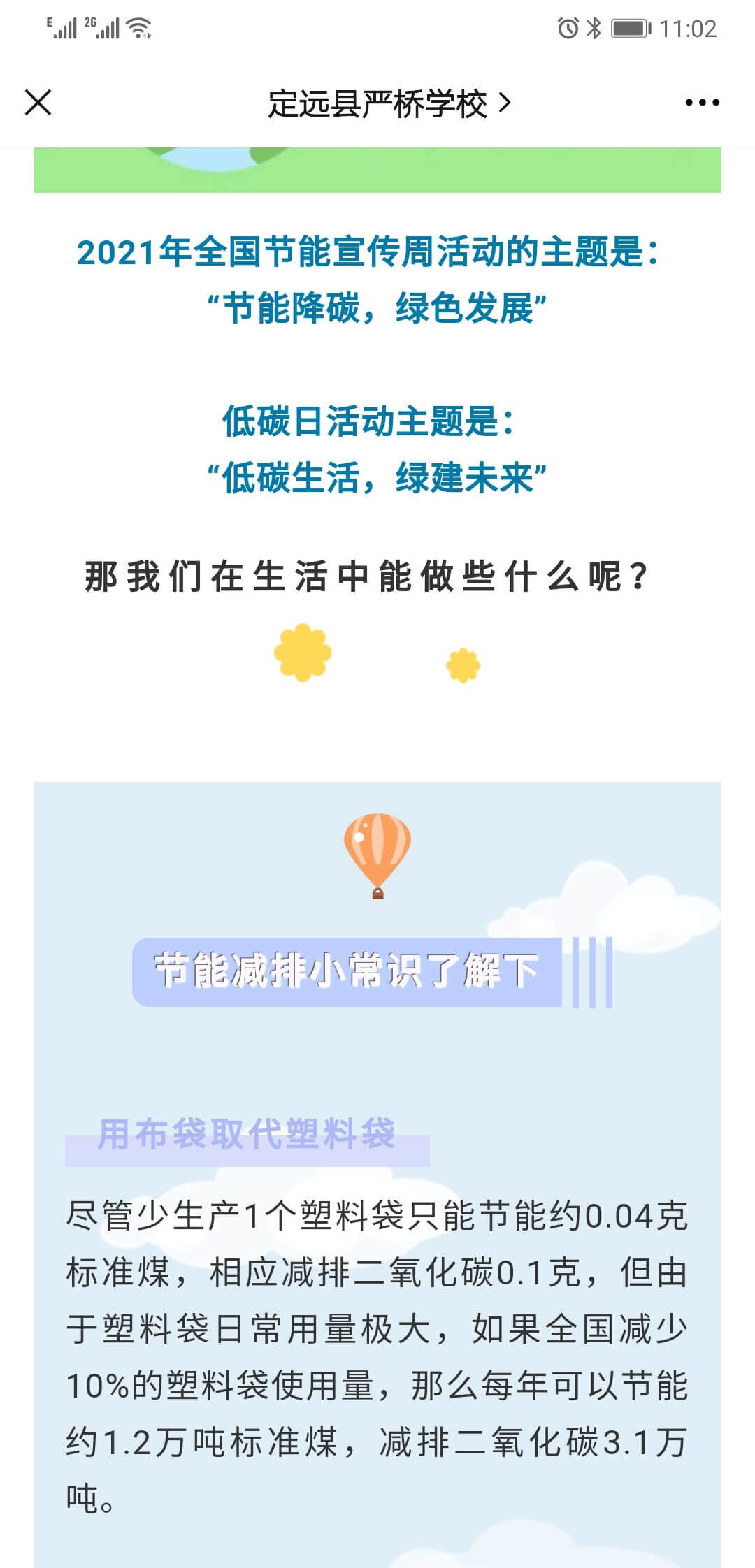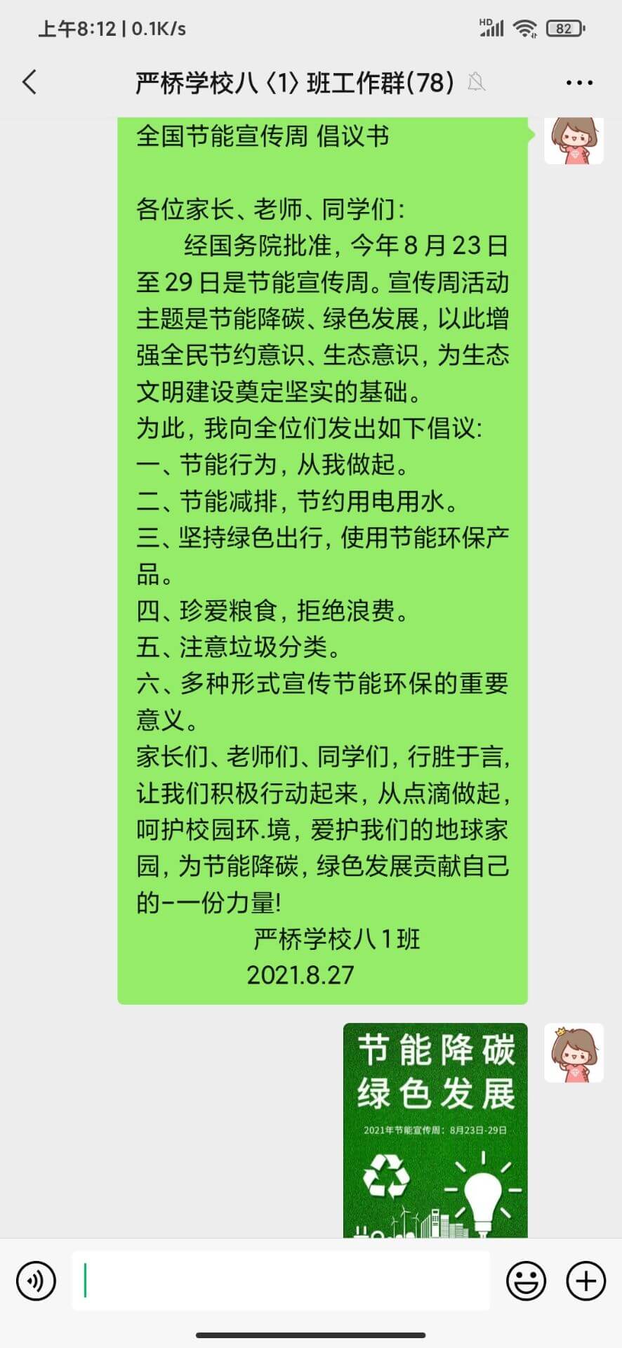 ~ 8月23日至8月29日为全国节能宣传周,今年主题为“节能降碳,绿色发展”。为提高全体师生和家长朋友们节约资源、保护环境的意识,倡导勤俭节约、绿色低碳的社会风尚,全力构建节约型社会,在2021年全国节能宣传周之际,定远县严桥学校积极开展了全国节能宣传周系列教育活动。