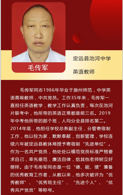 ~ 我是定远县池河中学总务副主任、英语教师毛传军,现在分管学校寄宿制工作。1986年7月,我毕业于滁州师范学校,此后的35年,我一直辛勤耕耘在定远县农村教育的沃土上,精心育苗,默默奉献,忘我工作,在平凡的岗位上做出了不平凡的业绩。