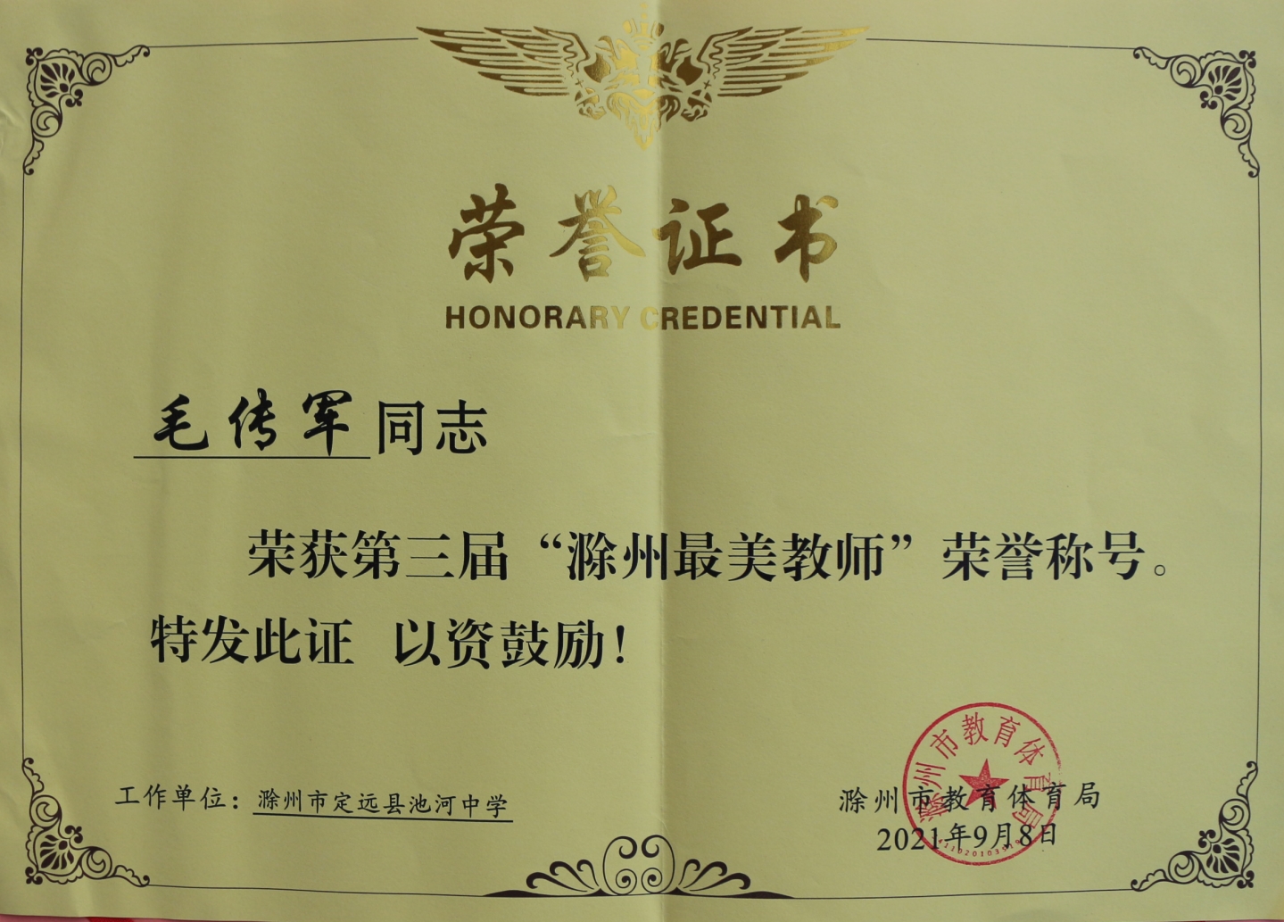 ~ 活动中,与会领导为第三届“滁州最美教师”代表颁奖,定远县池河中学教师毛传军获此殊荣。为褒扬广大人民教师立德树人、爱岗敬业、为人师表、严谨治学的先进事迹,展示滁州市教师队伍良好的职业形象和崇高的精神风貌,发挥先进典型的示范引领作用,毛传军老师作为5名优秀教师代表之一走上主席台作了首场事迹宣讲。