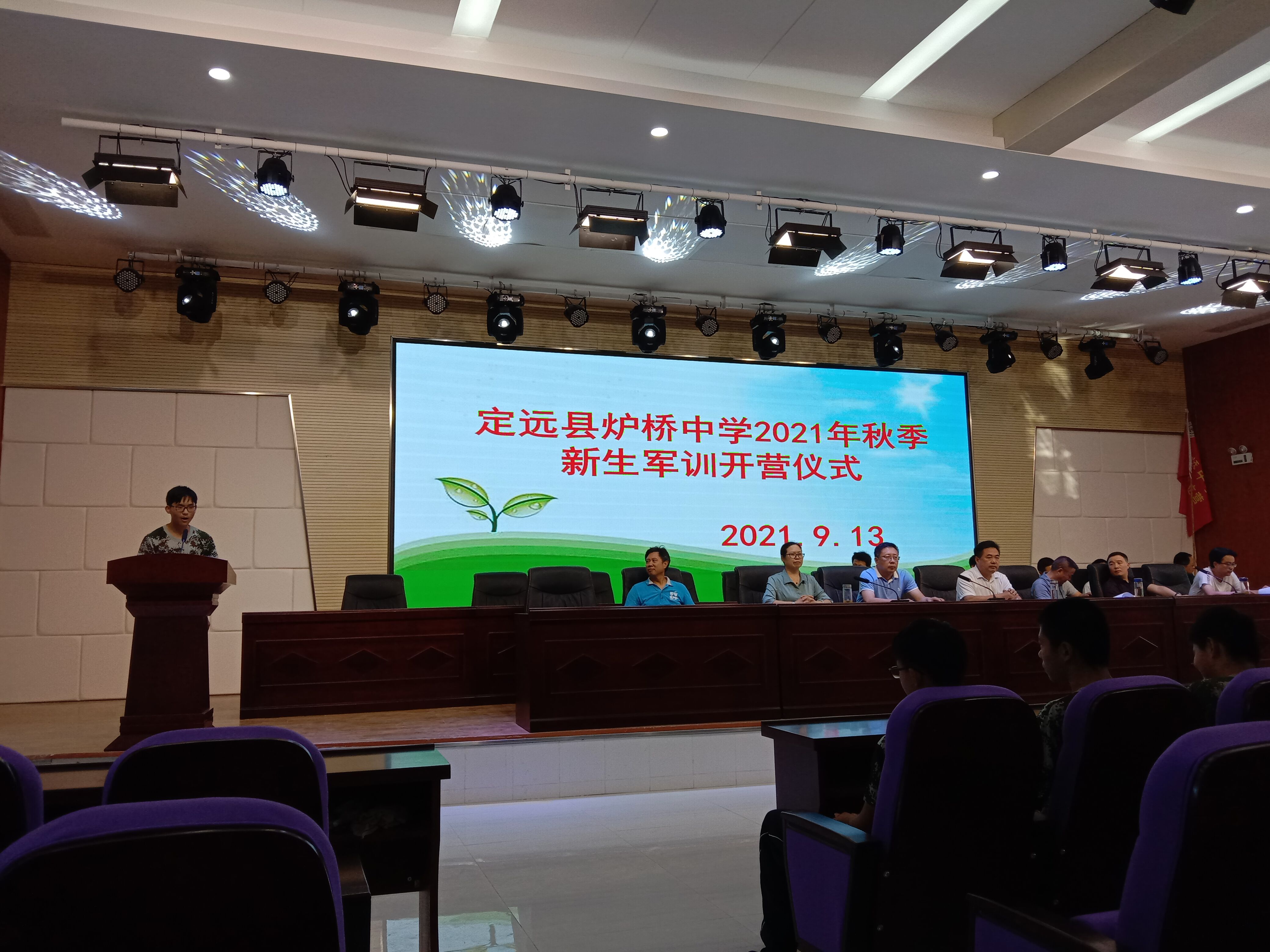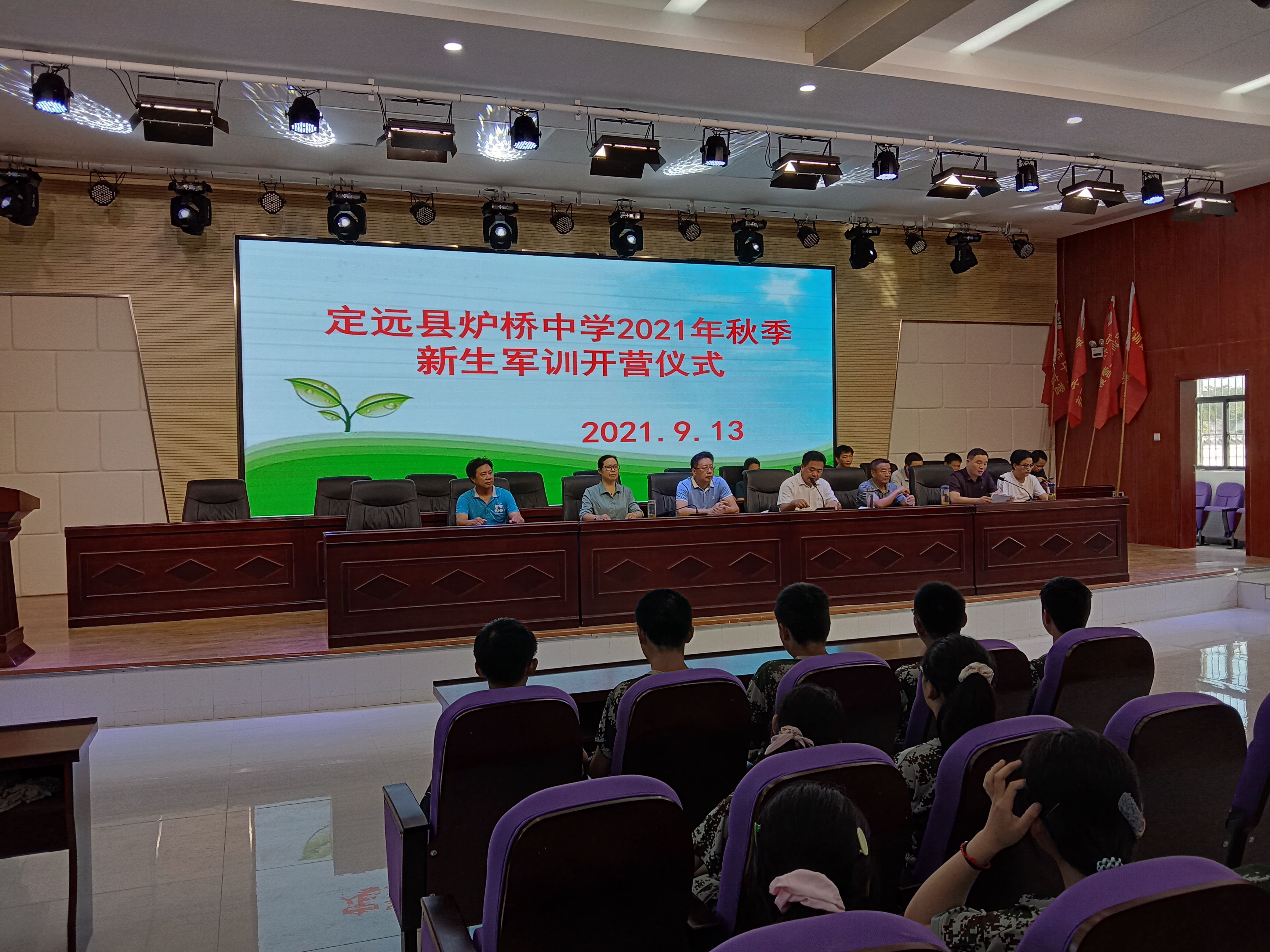 ~ 9月13日,定远县炉桥中学在学校报告厅举行了2021年秋季高一新生军训开营仪式,大会由校团委书记主持,学校领导、县武装部军训教官及116名新生参加了仪式。本届参加军训的新生编为一个独立营,下设三个连,营连长分别由教官担任,政委和指导员由学校分管校长及班主任担任。
