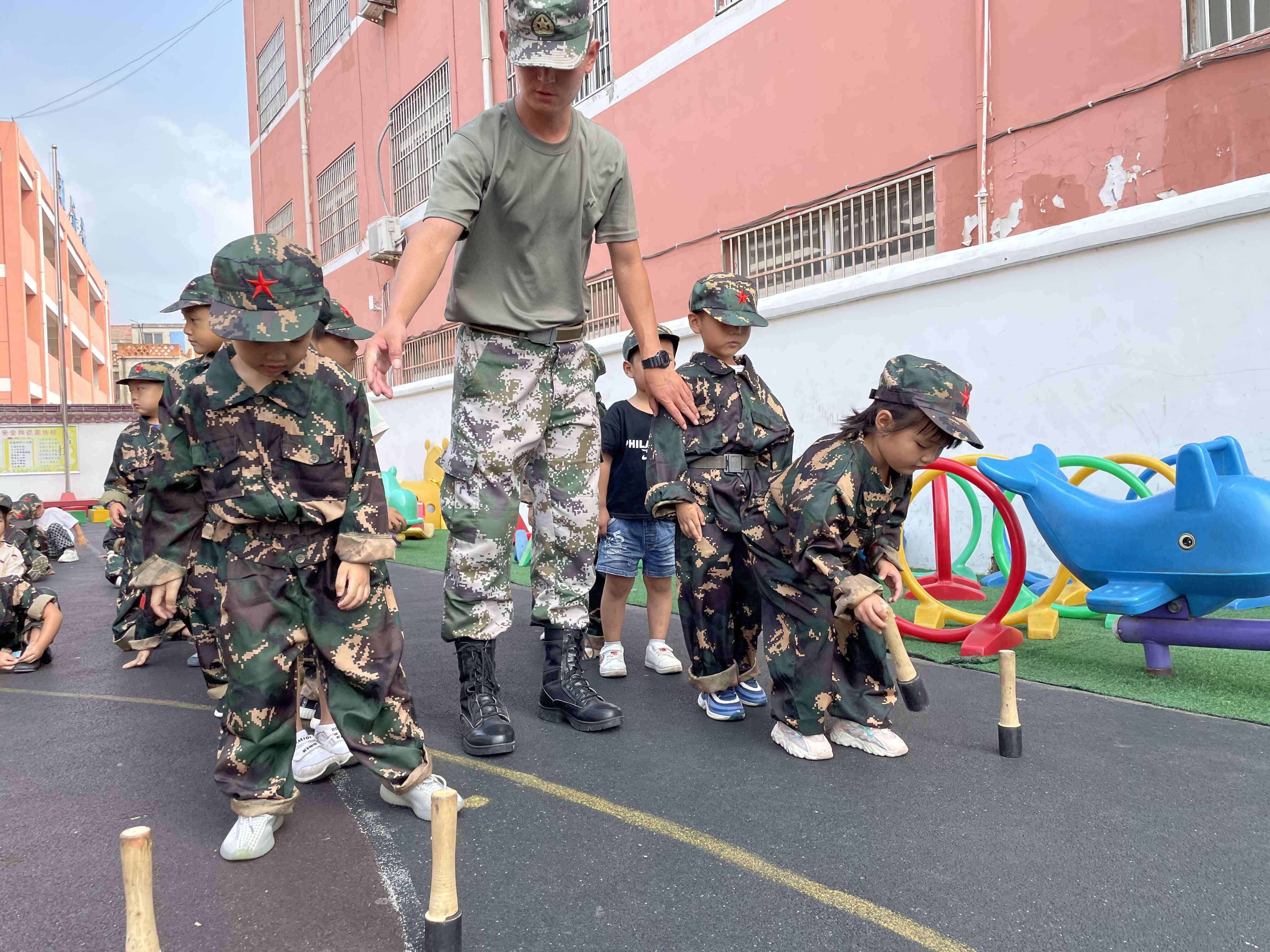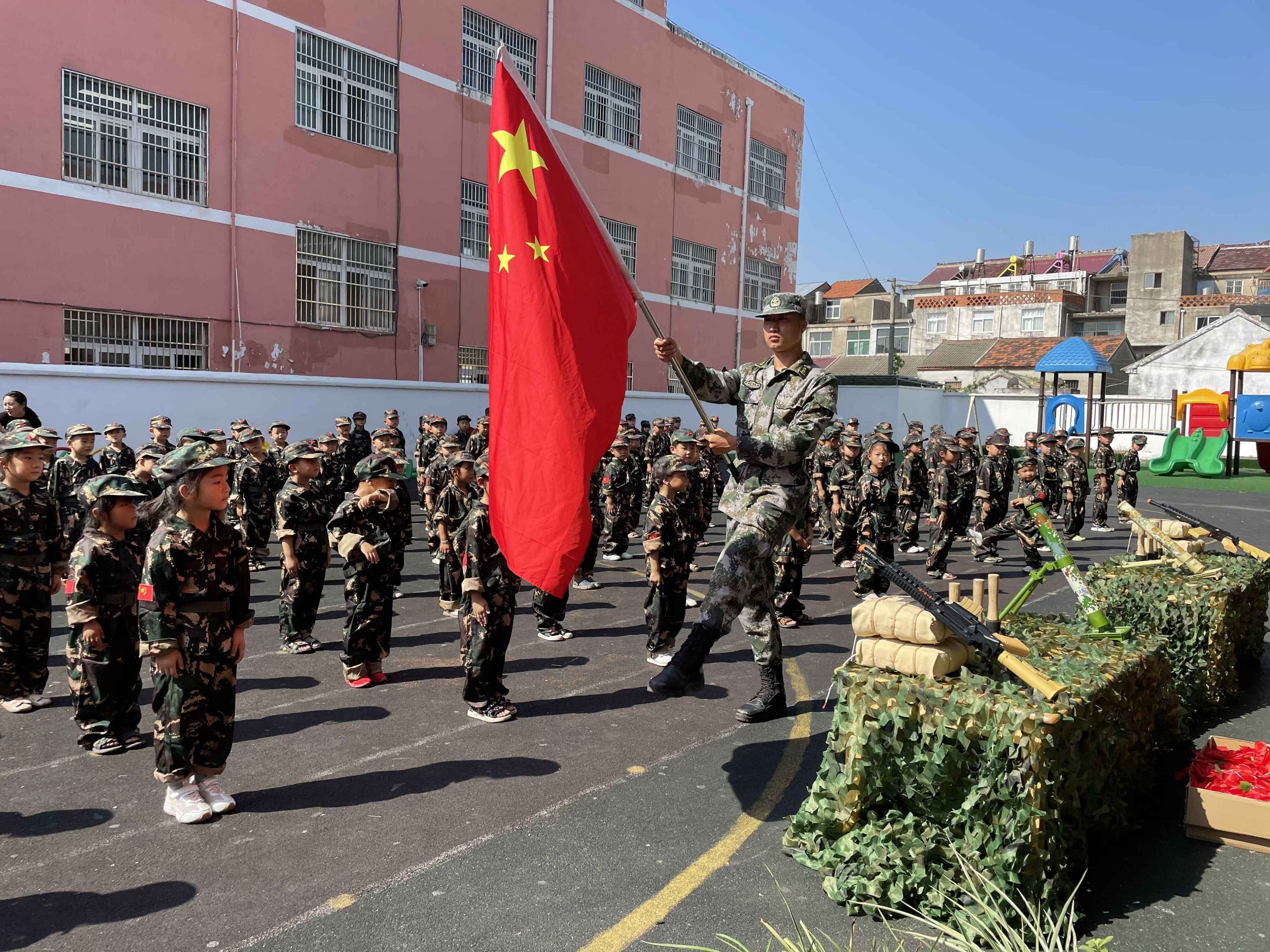 ~ 9月17日上午,全体幼儿在操场集合,孩子们动作虽稚嫩,却是别样认真,眼神坚定。活动开始,教官给孩子们讲解了五星红旗的由来,并为孩子佩戴上光荣的小红花。耳边传来义勇军进行曲的歌声,所有的小士兵们都面对缓缓升起的国旗敬礼。随着升旗仪式的结束,小士兵开始宣誓,他们的宣誓铿锵有力,无不透露出一种战士们的坚韧和硬气!接下来教官引导孩子进行了钻山洞,扔手榴,跳障碍等一系列活动,一时间将现场气氛推向高潮,孩子们在快乐中学到了知识,锻炼了身体。