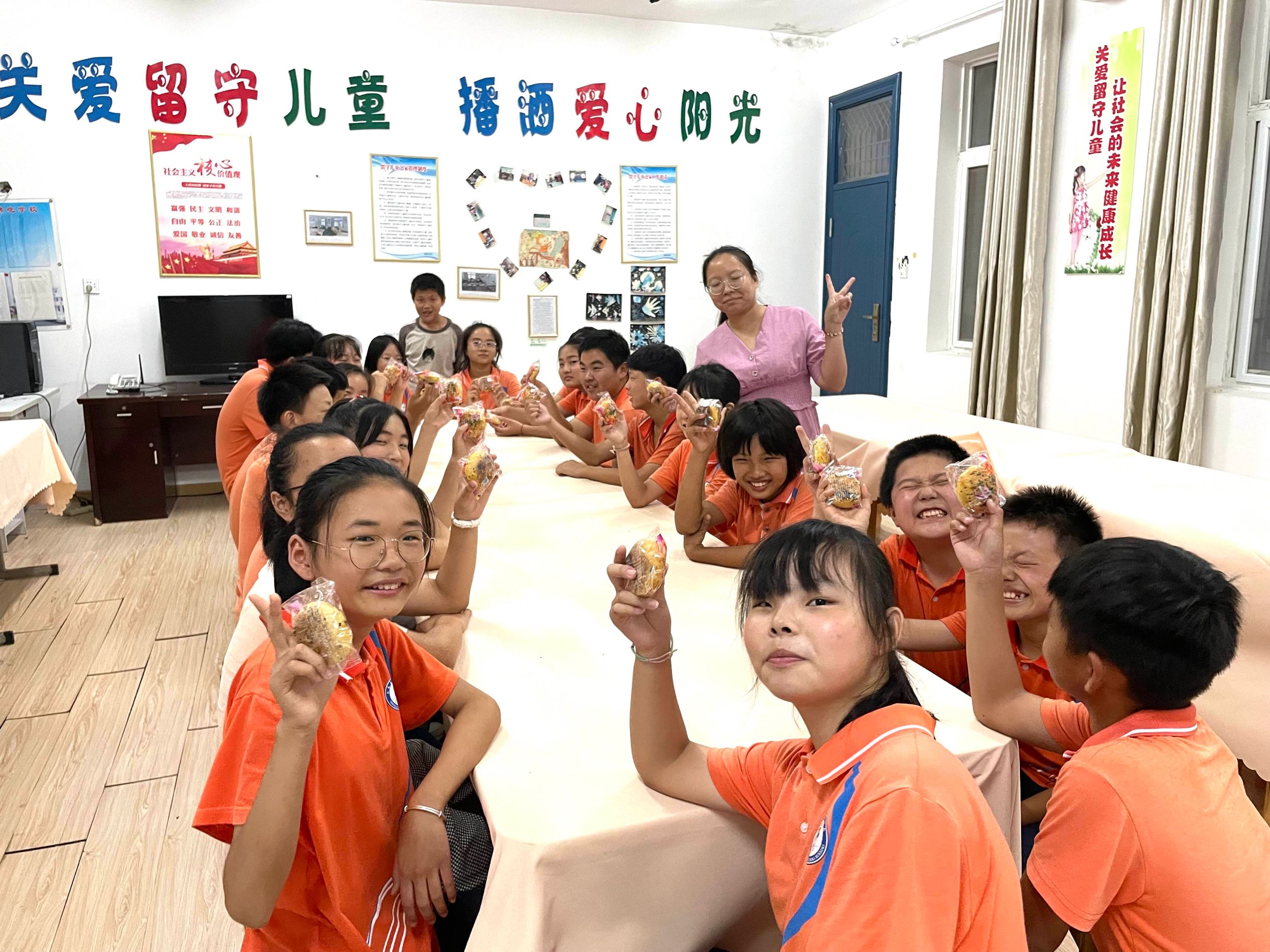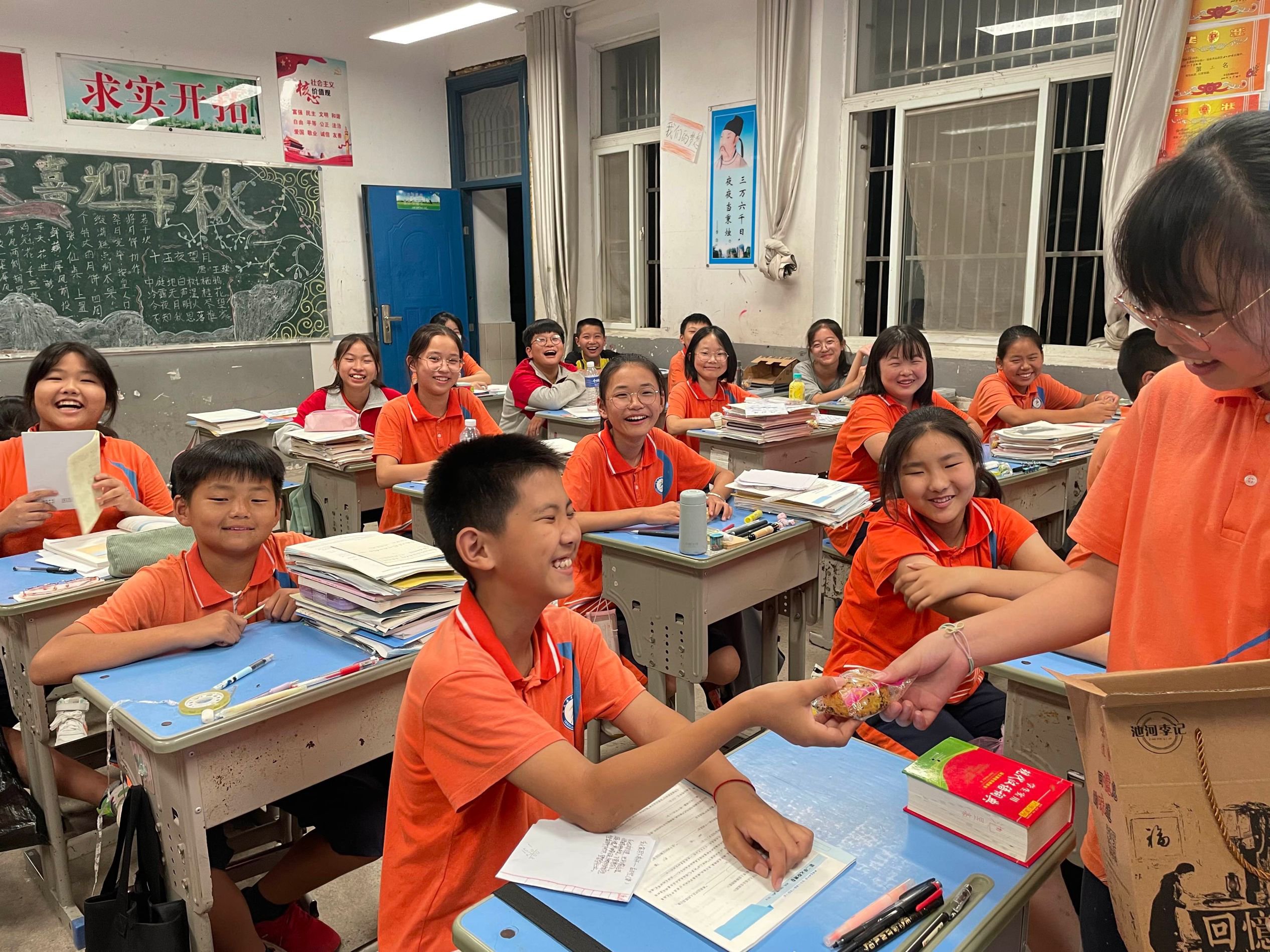 该校组织了“爱国爱家,秀我书法”中秋书法展,“迎中秋、庆国庆”黑板报评比等活动。各班召开“赢月饼、猜中秋”主题班会,同学们一起吃月饼、猜灯谜,学生们在快乐的氛围迎中秋贺团圆。留守儿童功能室的老师为留守儿童准备了好吃的月饼,欢声笑语不断。