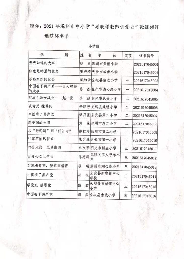 ~ 日前,滁州市2021年中小学“思政课教师讲党史”微视频大赛评选结果揭晓,定远县委教体工委推荐的3篇作品喜获佳绩,成绩喜人。
