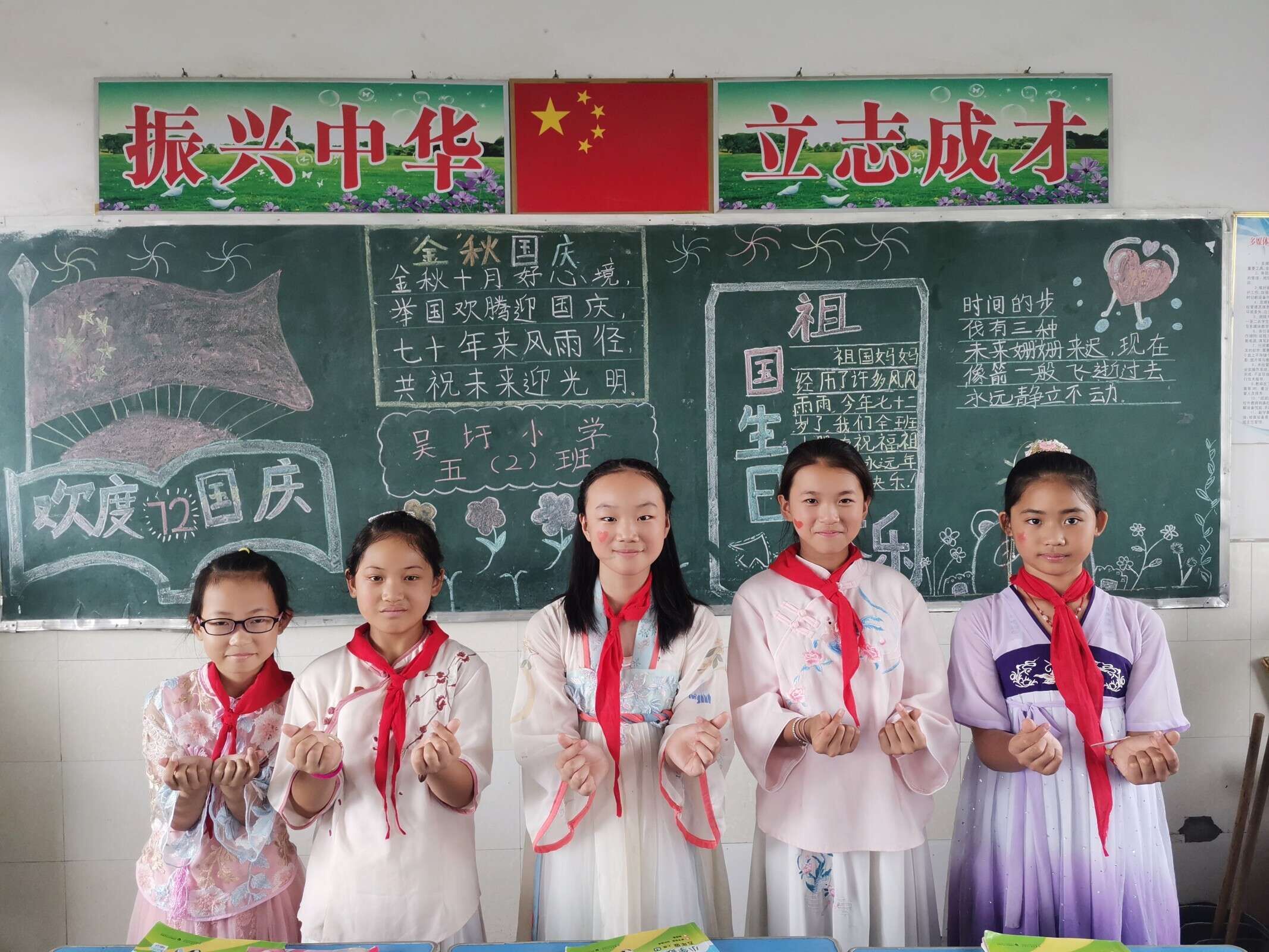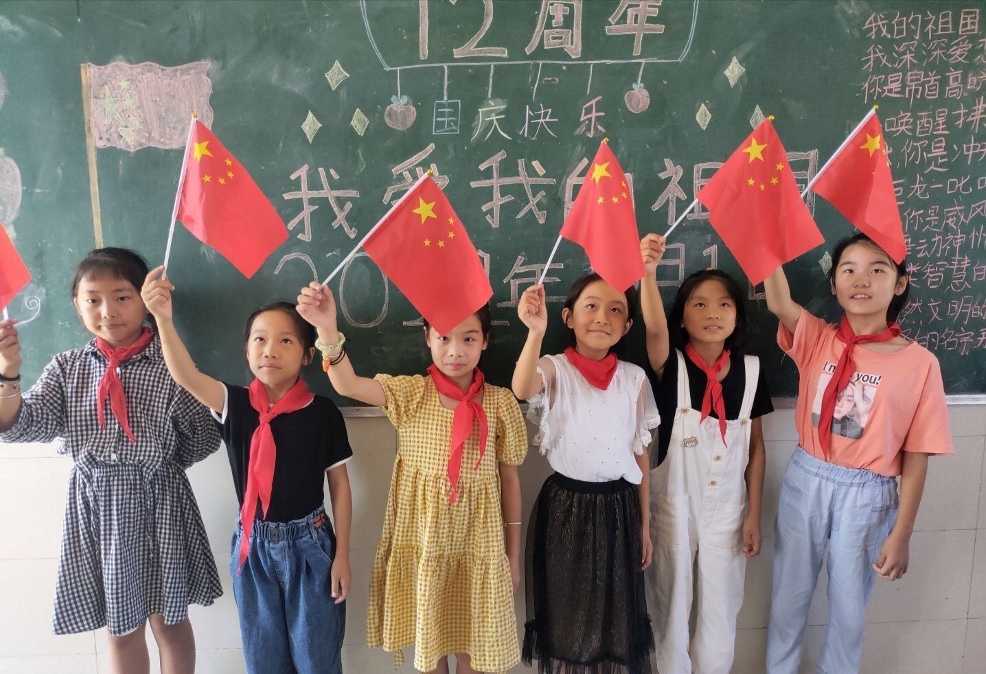 ~ 在各班主任的组织下开展“我与国旗合个影 我为祖国送祝福”实践活动。孩子们争相与国旗合影,满脸洋溢着欢乐的笑容,摆出各种造型,用行动祝福祖国生日快乐。各班还进行了“迎国庆”黑板报评比,用笔书写对伟大祖国的无限热爱和深情祝福。(供稿:张二妹 审核:童超)