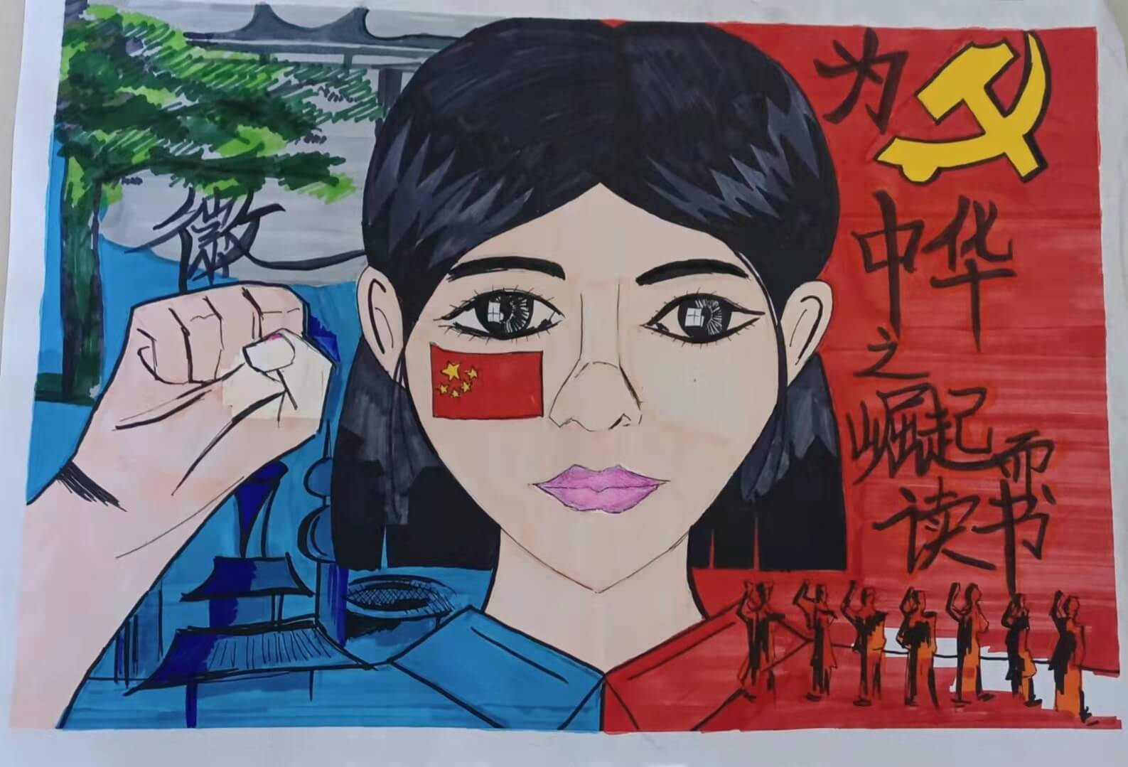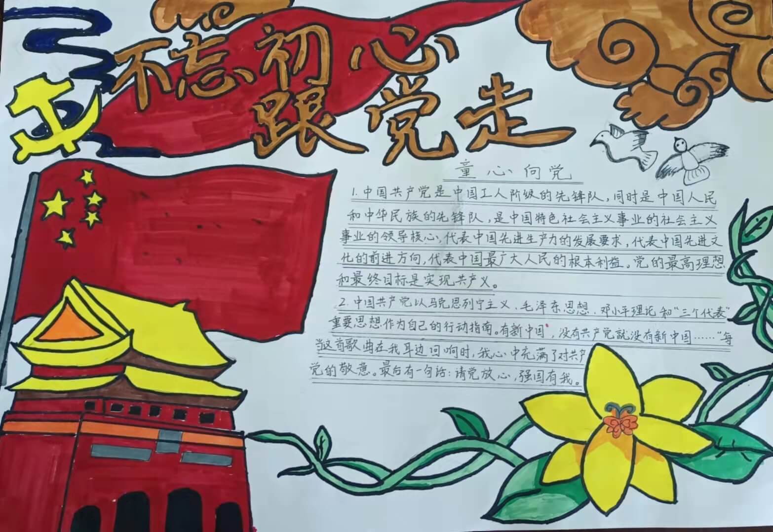 ~ 学生通过观看相关视频,了解国旗、党旗的由来、建国时间、国旗含义等国庆节知识,然后自由设计书法绘画作品送给祖国母亲。活动过程中还开展了党旗、国旗法、“四史”知识竞赛。学生们唱爱国歌曲、制作“童心向党,我为祖国送祝福”主题手抄报表达对祖国热爱和美好愿望。