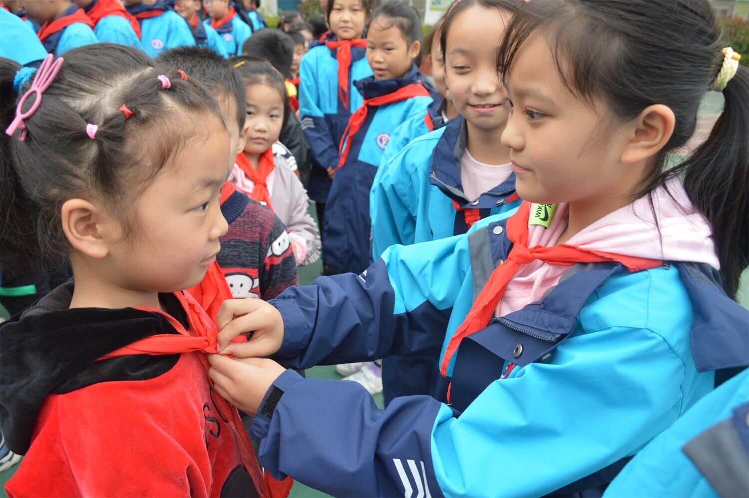入队仪式开始,队旗前,大队辅导员王琴老师宣读了组建一年级少先队组织的决定并宣布新队员名单。接着,按入队程序,五年级老队员为一年级新队员佩戴红领巾,新队员代表讲话,学校党支部书记、校长杨孝前为新成立的各中队授旗,优秀学生代表为新任中队辅导员佩戴红领巾等。最后,新队员们高举右拳,面向队旗,在大队长的带领下庄严宣誓。响亮的誓言在校园回荡,时刻鼓舞着新队员们朝着未来和理想努力奋进。