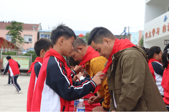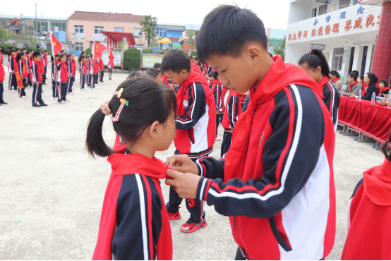 天河小学少先队大队委为参会领导、老师佩戴红领巾。