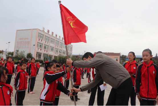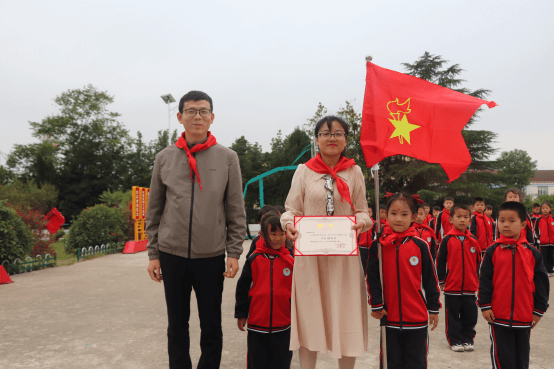 团县委书记李大鹏为晨光中队授中队旗,为中队辅导员颁发聘书并合影留念。