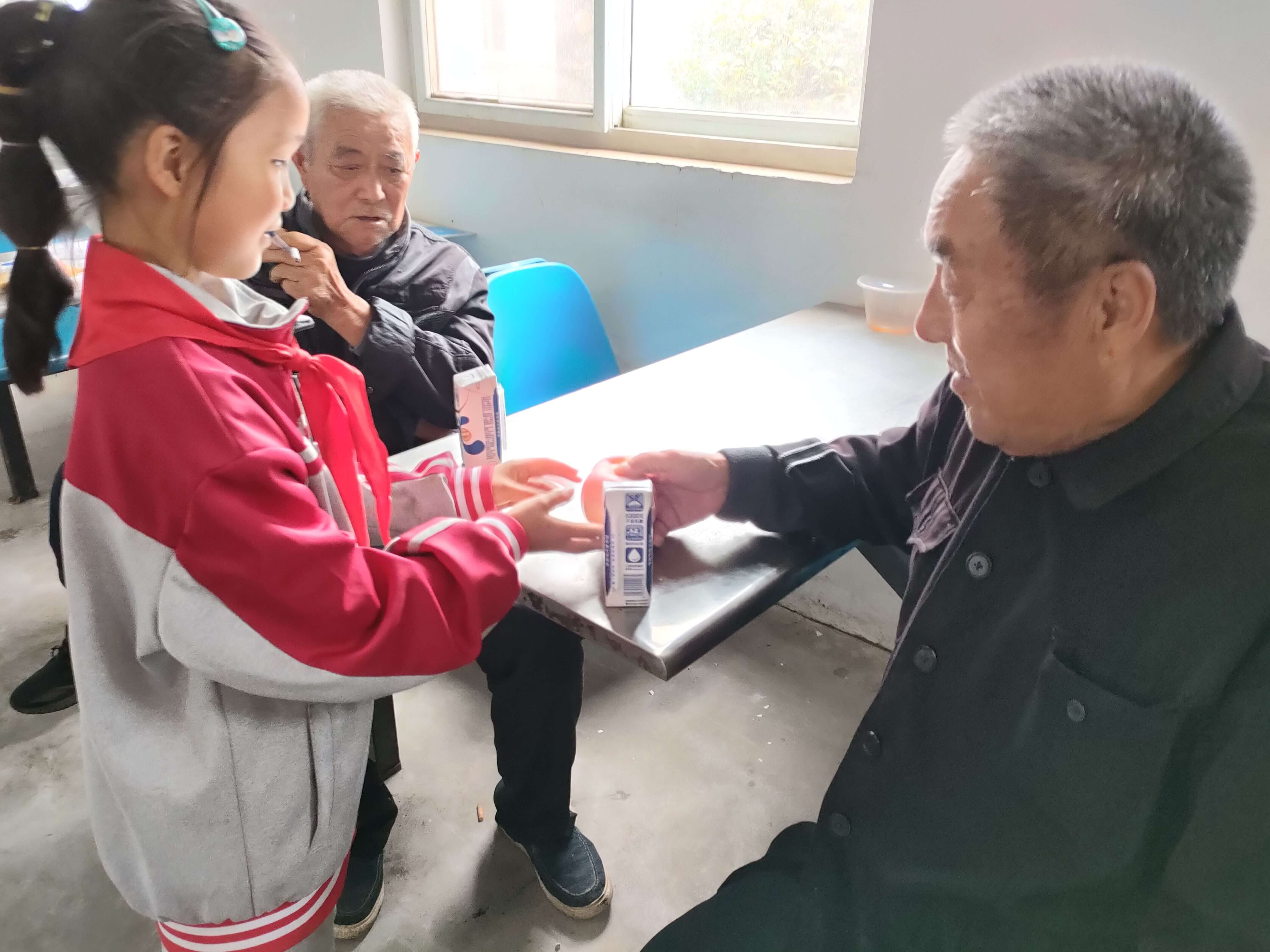 活动中,大队辅导员代表学校向老人们致以节日的问候,他指出,老人们现在也如同孩子一样需要得到关爱呵护,他们也曾为社会做出贡献,我们不能忘记。随后志愿者老师们和留守儿童代表们一一向老人们嘘寒问暖,并分发了牛奶、面包、水果等节日慰问品,老人们脸上洋溢着幸福的笑容。