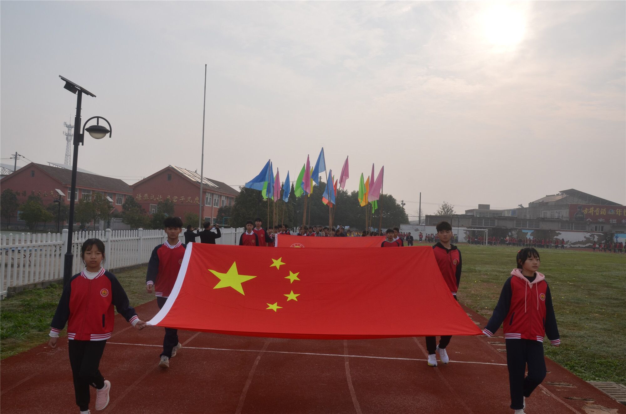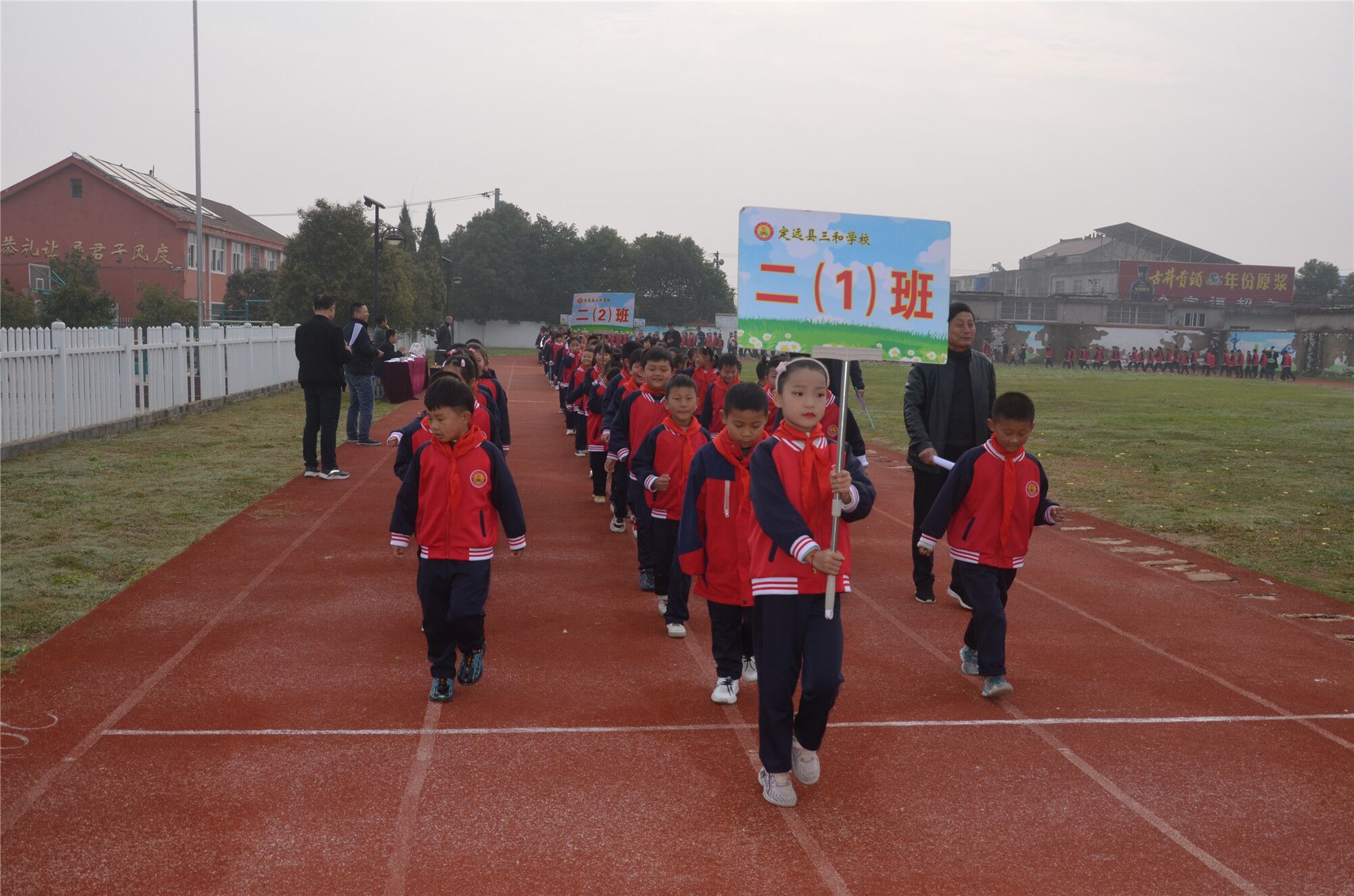 当日上午8点,运动会开幕式在该校运动场举行。在雄壮有力、刚健豪迈的《运动员进行曲》的音乐声中,国旗护卫队带头,校旗护卫队、彩旗队紧随其后,各班运动员喊着铿锵有力的口号,整齐有序地进入场地。高亢嘹亮的国歌声中,五星红旗冉冉升起,三和学校2021年秋季运动会正式拉开帷幕。