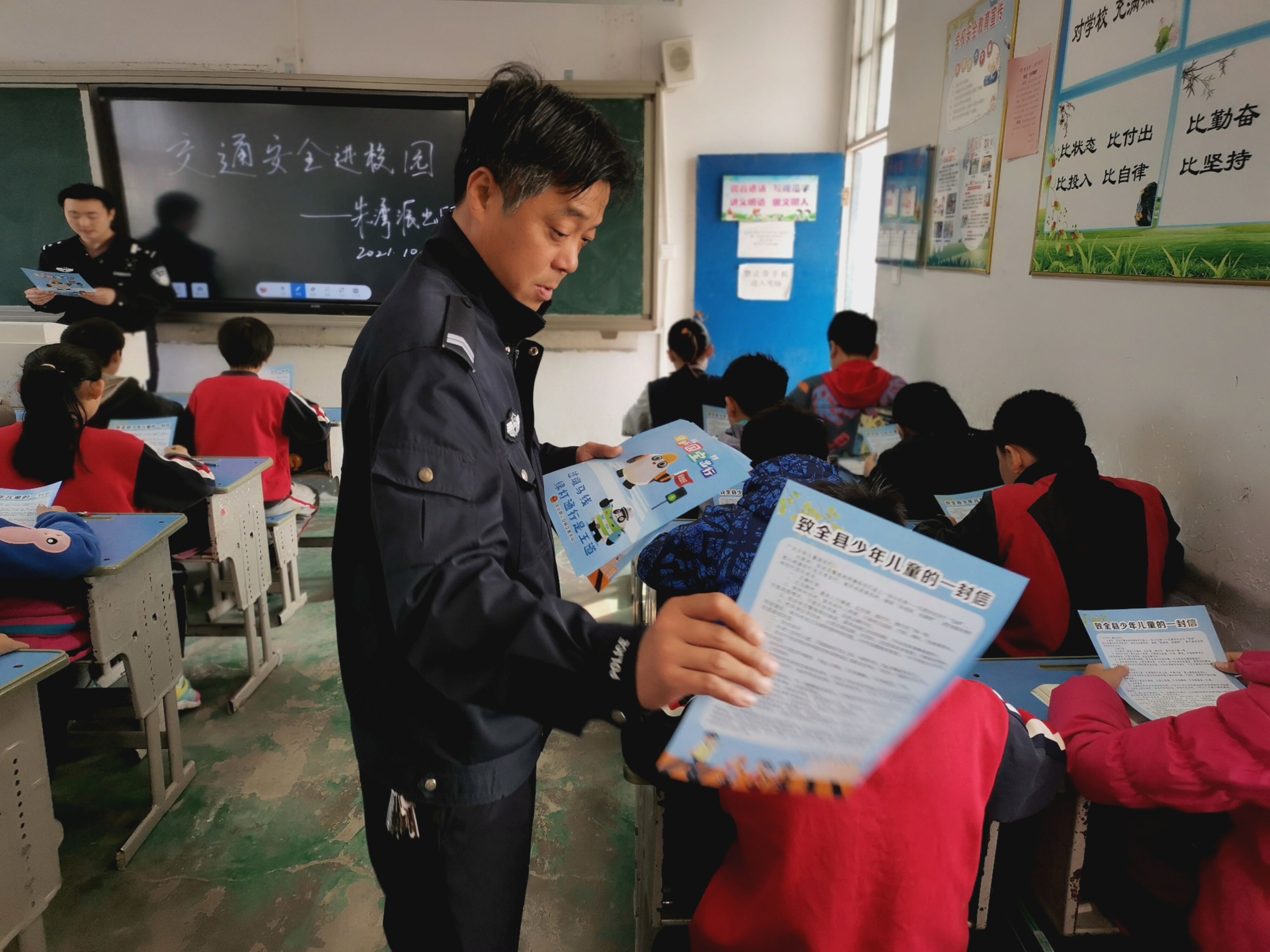 10月27日,定远县朱湾镇派出所民警走进朱湾小学,开展“交通安全进校园”宣传活动。
