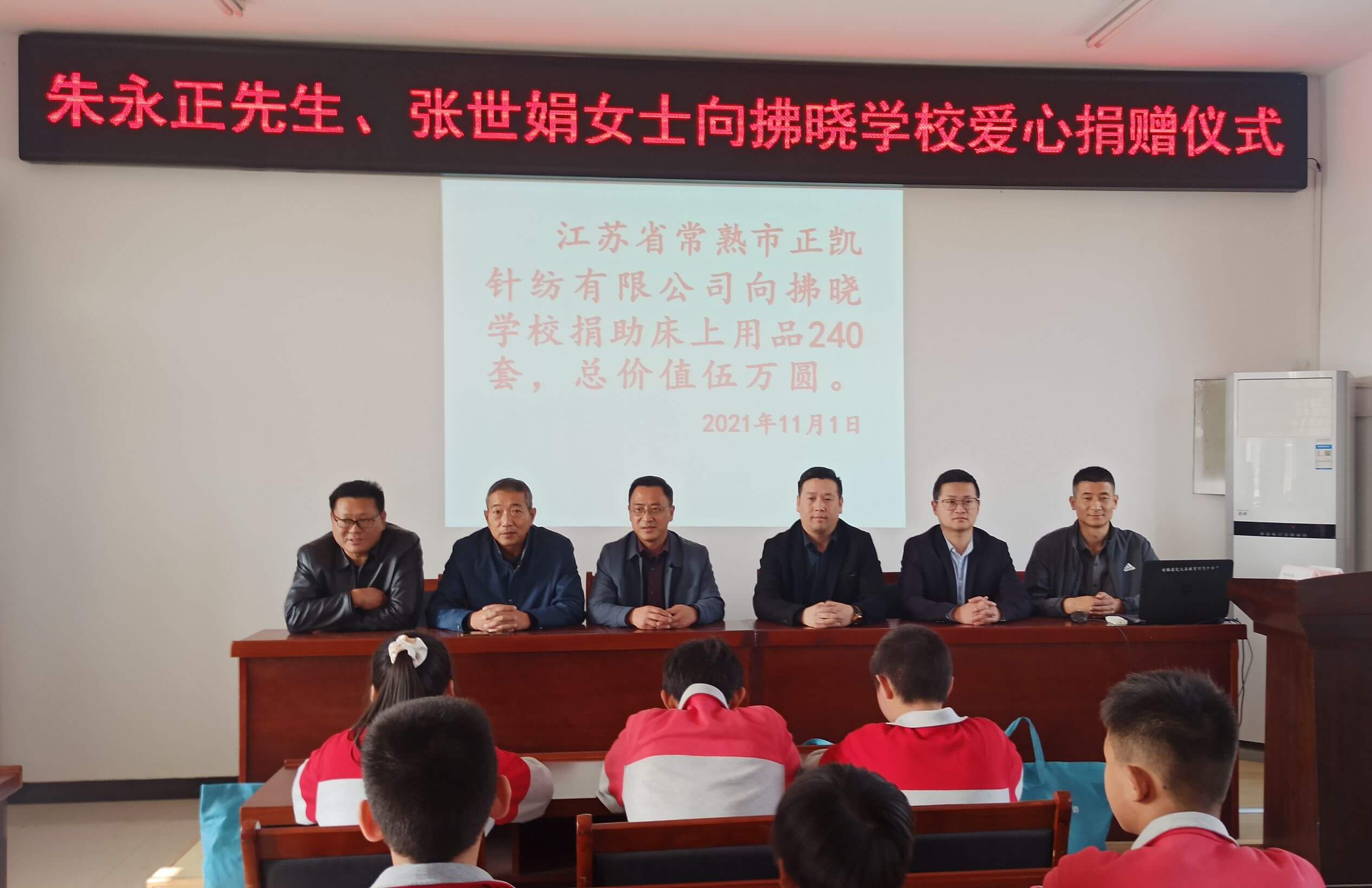 11月1日,江苏省常熟市正凯针纺有限公司董事长朱永正来到拂晓学校,向该校品学兼优的留守儿童捐赠生活用品,共捐助生活用品240套,总价值五万元。