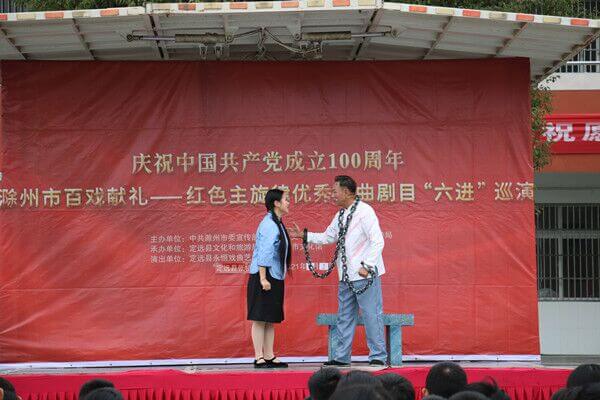~ 本次“戏曲进校园”演出曲目有黄梅戏《谁是新娘》、《洪湖水浪打浪》、《火种》等经典曲目。其中现代黄梅戏小戏《谁是新娘》,讲述了抗日战争时期,定远县藕塘镇令狐山下一对恋人在举行婚礼时,新娘为救被日伪军追捕的区委书记,选择让区委书记假扮新娘,自己舍生取义的故事。另一部黄梅戏小戏《火种》,讲述了革命烈士崔筱斋临刑前,敌人设计让其妻和女儿劝说交出党组织名单,被其断然拒绝的精彩片段。该剧通过展现崔筱斋与妻女狱中诀别的一幕,回顾了他革命的一生,展现出共产党员宁死不屈,英勇就义的伟大品质。