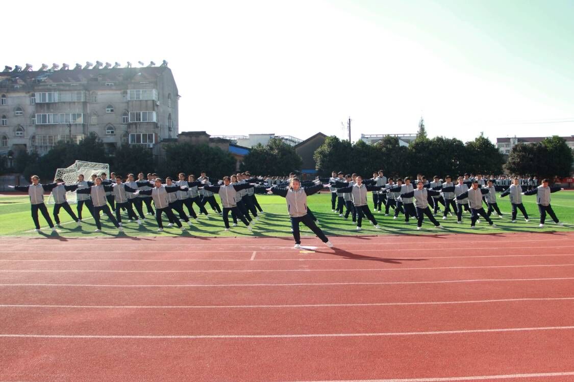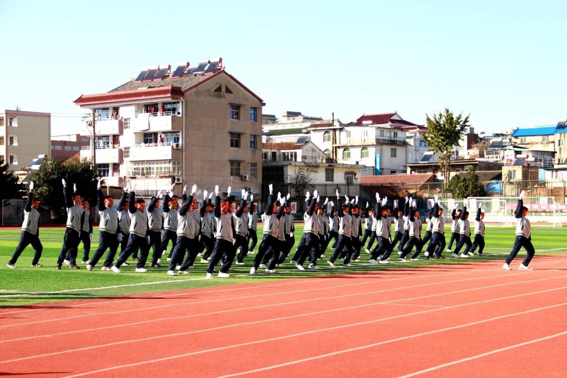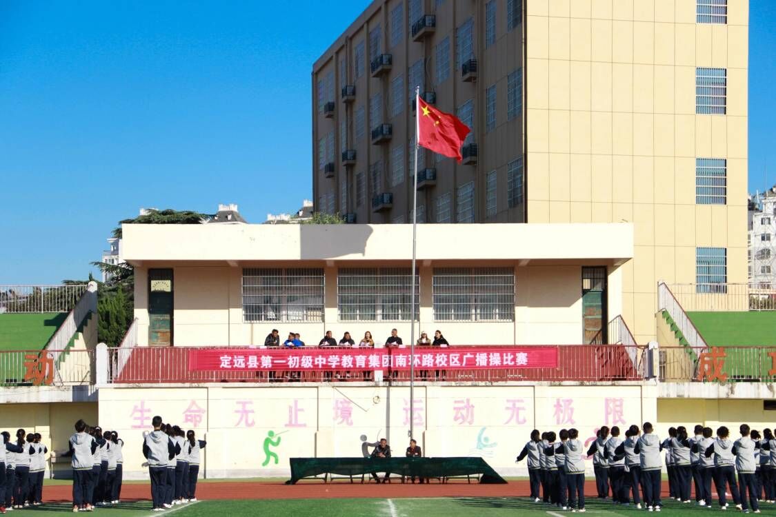 ~ 11月8日,定远县第一初中教育集团南环路校区七年级举行了一场别开生面的第三套广播操比赛。首先是校长张书清做动员讲话,然后同学和裁判员代表做表态发言,接着比赛正式开始。各个班级穿着整齐的校服、迈着有力的步伐、高喊嘹亮的口号进入赛场,展示洒脱优美体操,显示蓬勃潇洒风采,表现了一初中学生昂扬奋进、拼搏向上的精神风貌。